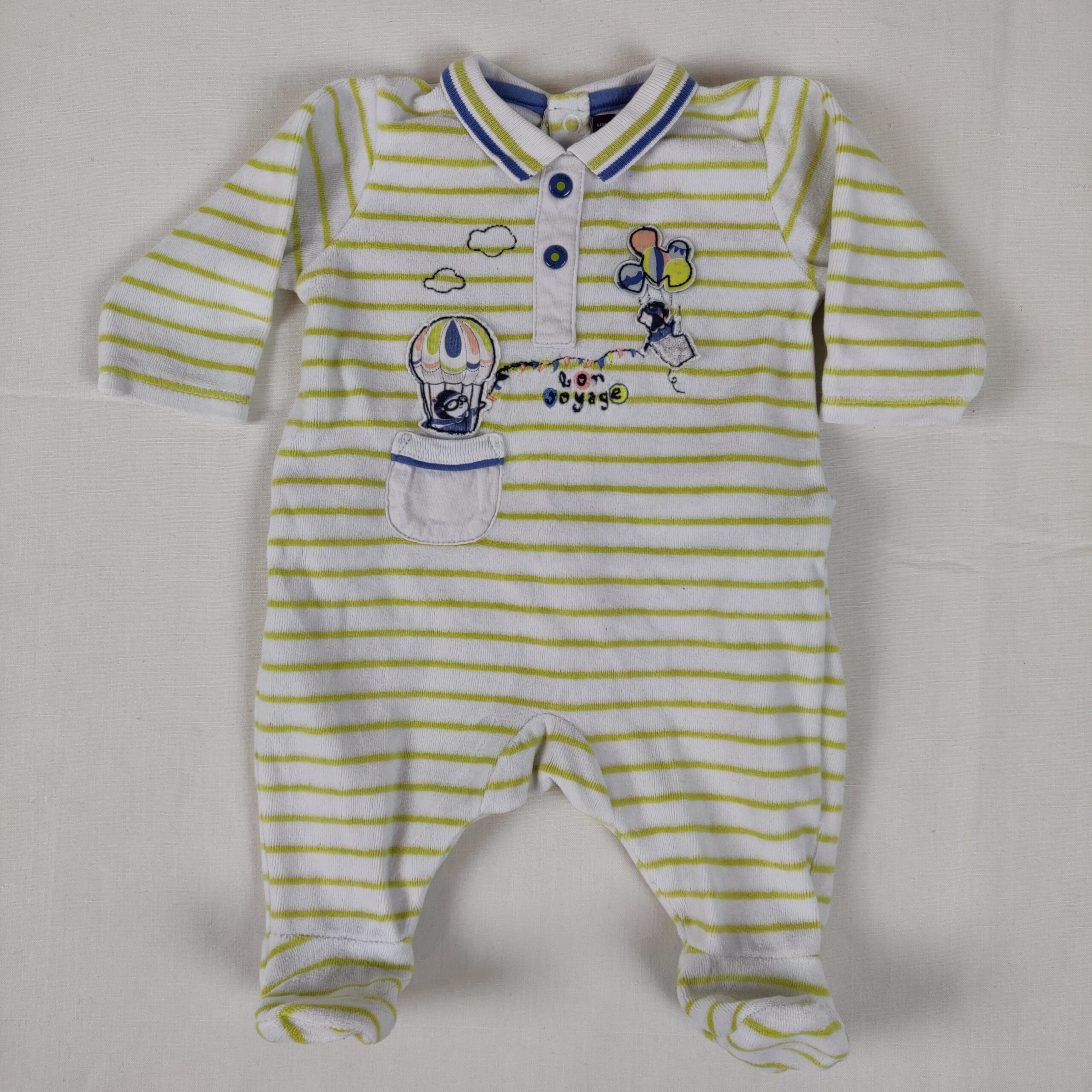 Autres commentaires : contient du polyester. Pyjama en velours écu à rayures vert anis, col polo écru, vert anis et bleu électrique. Fausse boutonnière à l’avant, fermeture à l’arrière par boutons pression. Thème « bon voyage » avec deux petits ours en montgolfière.
