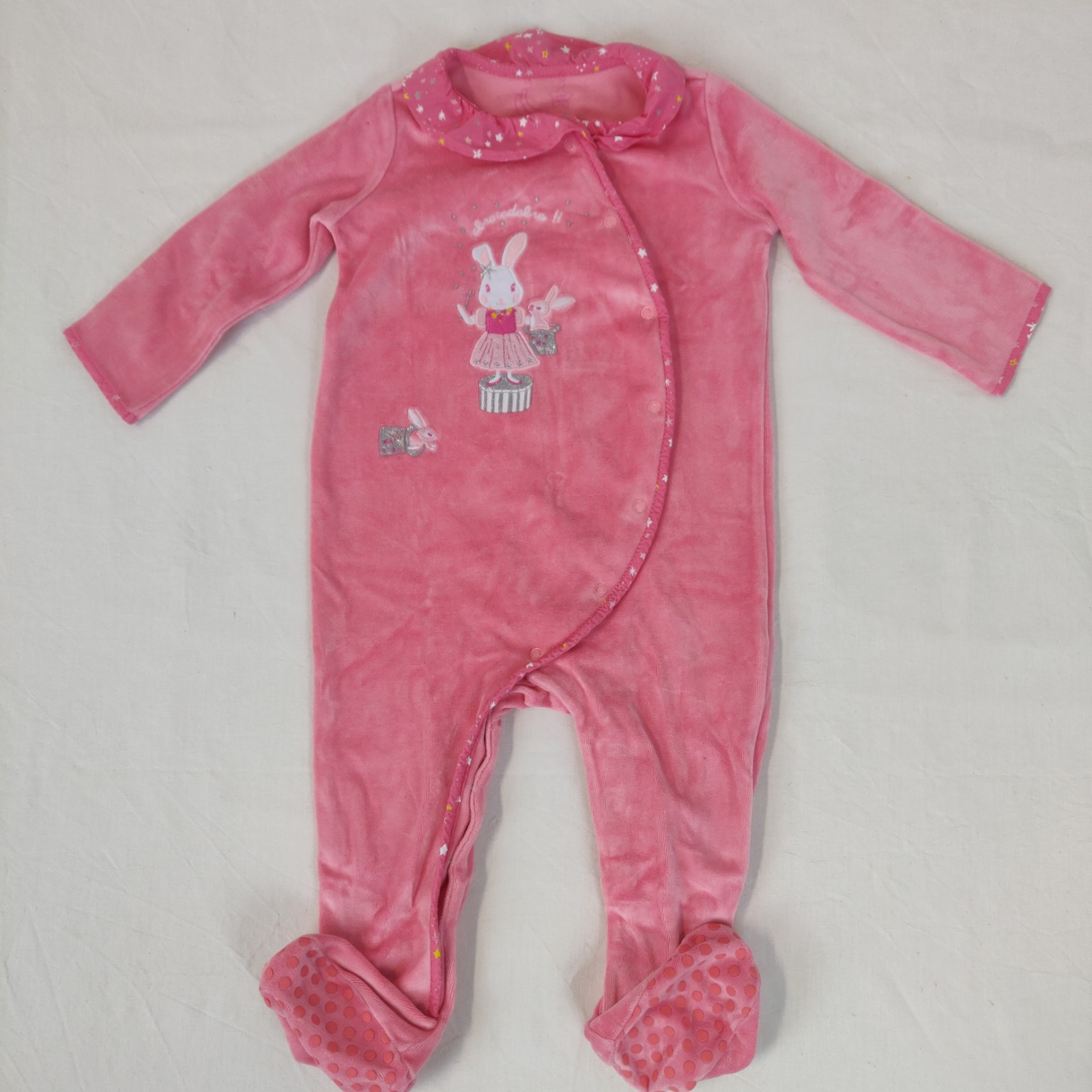Autres commentaires : 27% polyester. Pyjama 1 pièce DORS-BIEN à manches longues et à pieds en velours – rose. Motif central lapine magicienne accompagné de l’inscription « Abracadabra ». Col claudine en tissu rose à motifs blancs, jaunes et roses étoiles. Semelles antidérapantes. Ouverture pressionnée au devant.