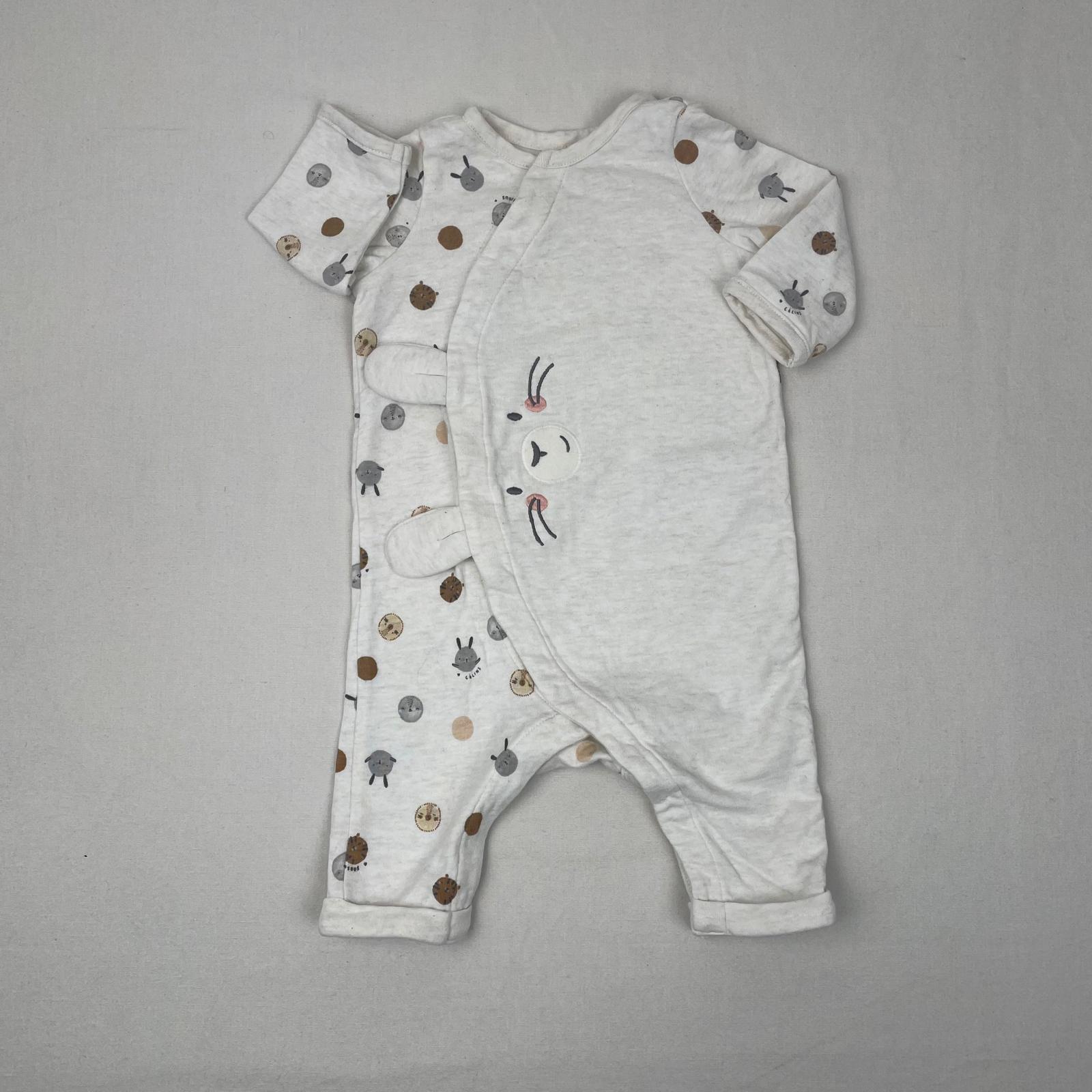 Autres commentaires : Pyjama 1 piéce, manches longues, devant en entre les jambes fermeture par boutons pression, les poignets des jambes sont retroussés, motifs parsemé de têtes de lapins, tigres et oiseaux en marron et gris, devant il y a un lapin avec des oreiles.