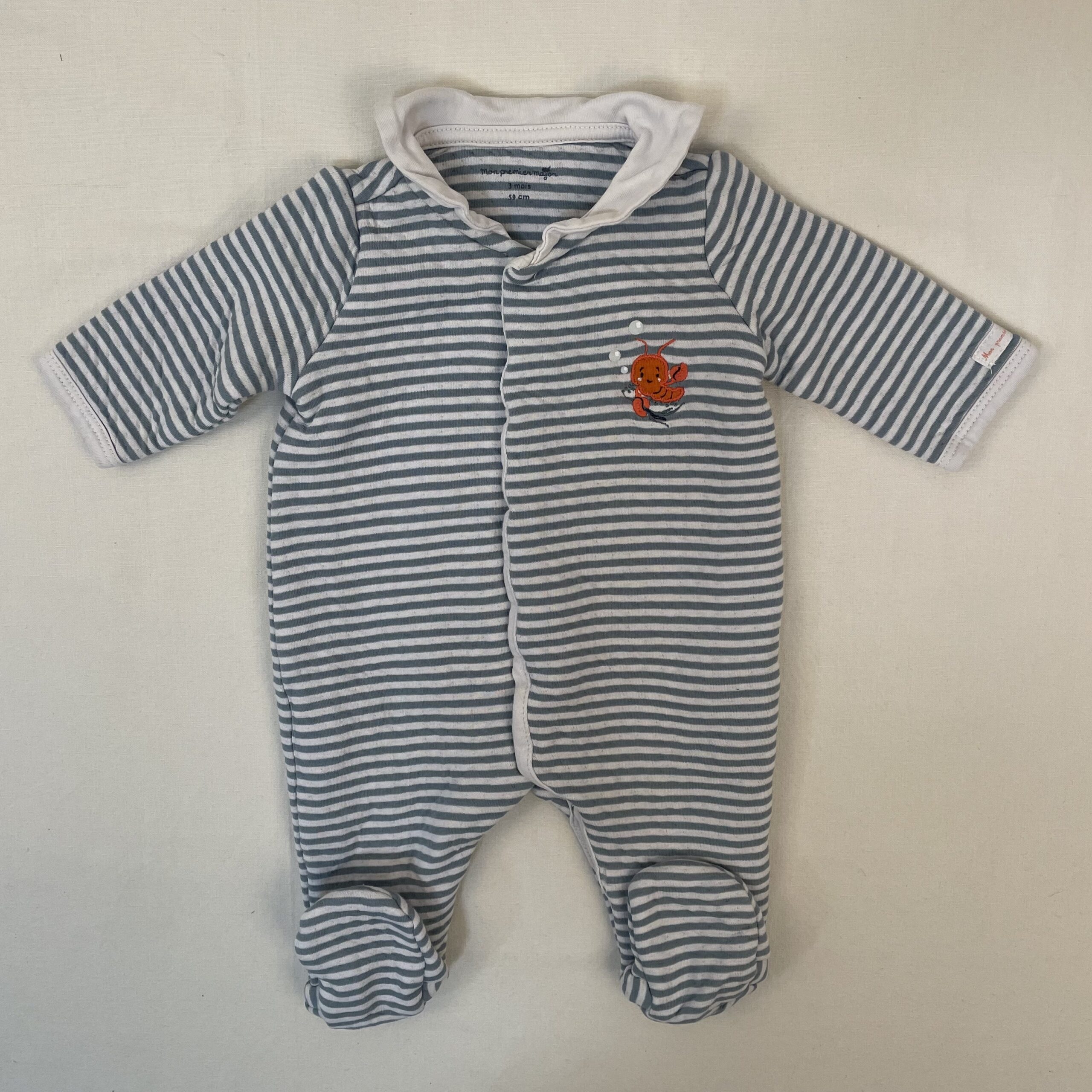 - Pyjama dors-bien chaud molletonnée, à rayures blanches et bleu polaire, devant petite broderie d’une écrevisse orange