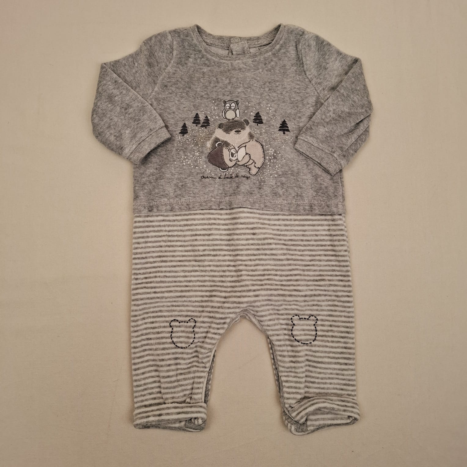 Autres commentaires : 23% polyester. Pyjama en velours gris sans pied, bas à rayures grises sur fond blanc, motif petits ours devant des sapins avec un patch en velours, des détails en tête d’ours sont présents sur les genoux, col rond, fermeture par boutons pression au dos.