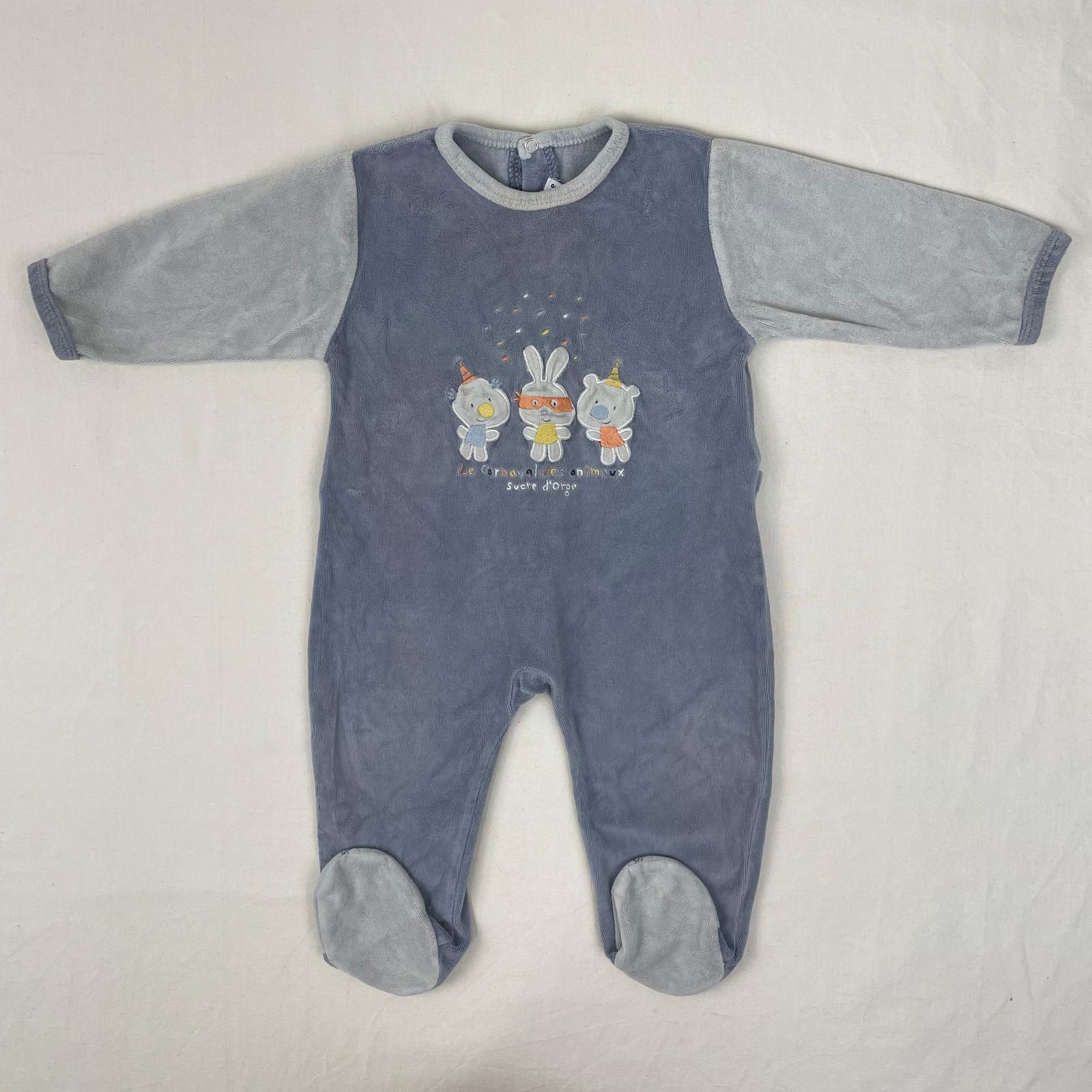 25% polyester. Pyjama 1 pièce en velours avec pieds, fermeture par boutons pression au dos, devant motif carnaval et inscription « Le carnaval des animaux. Sucre d’orge ».