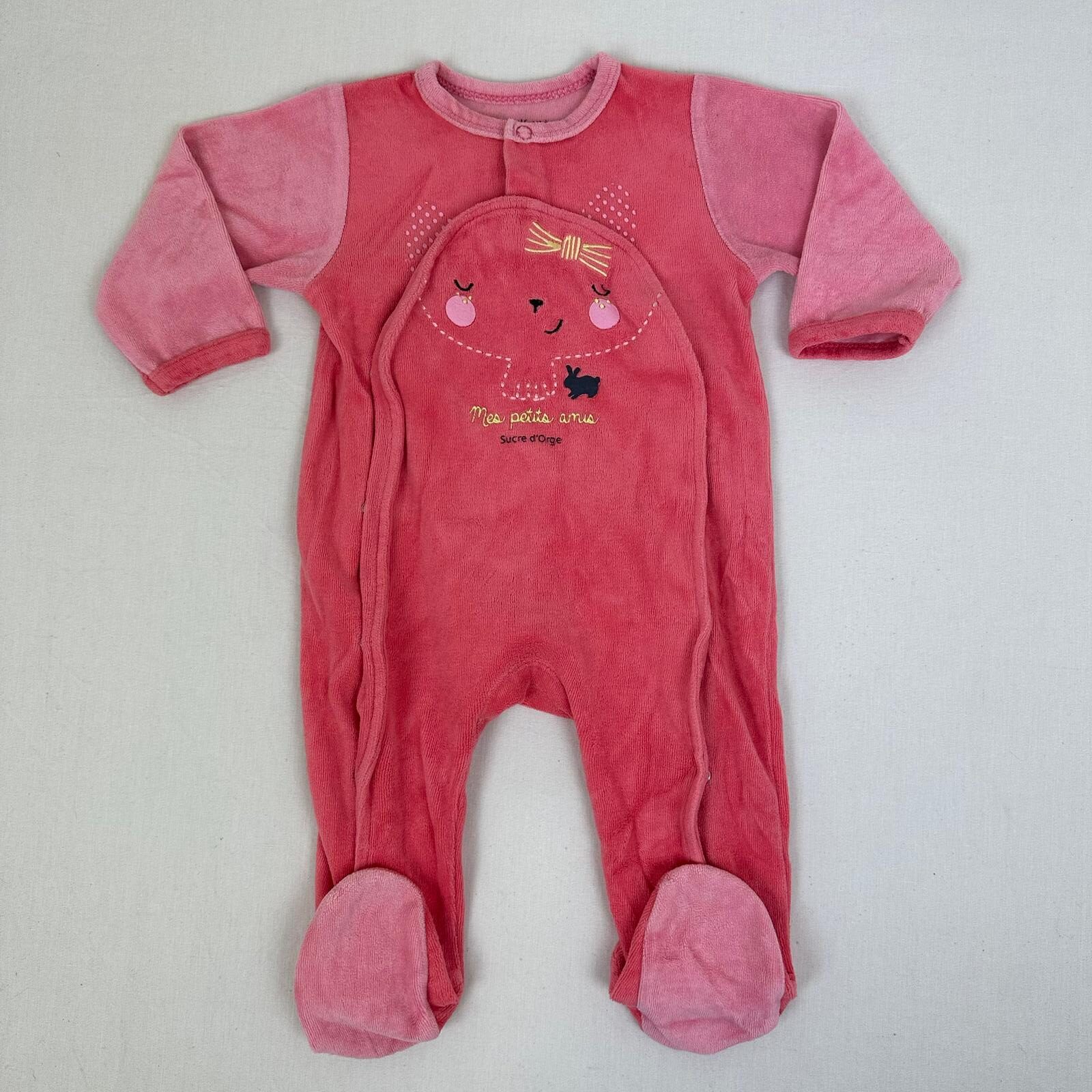 Autres commentaires : 25% polyester. Pyjamas une piéce rose manches longues, col rond et fermeture devant par boutons pressions jusqu’aux jambes.