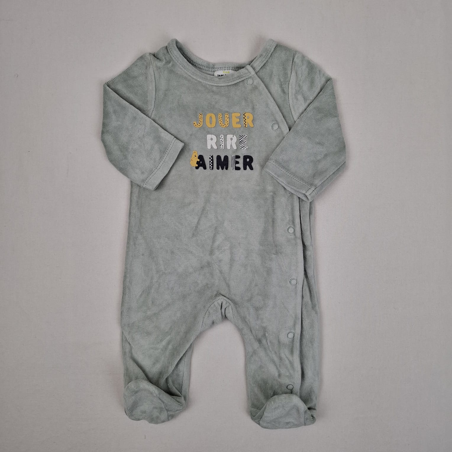Autres commentaires : Pyjama en velours turquoise clair, inscription « Jouer rire aimer », écriture légèrement craquelée, fermeture par boutons pression à l’avant gauche, col rond