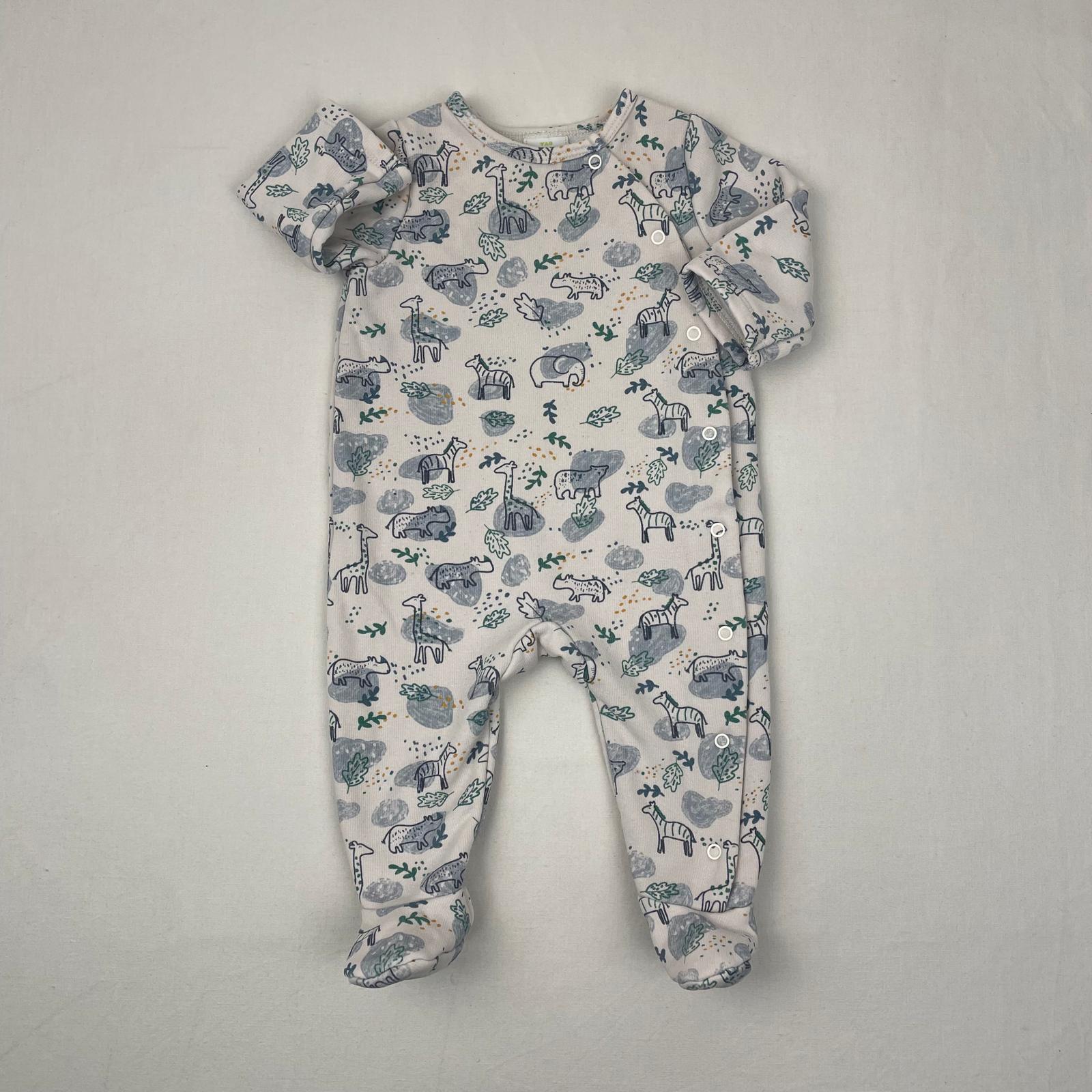 Autres commentaires : Pyjama blanc 1 pièce moletonné, avec pieds, en tissu à l’exterieur et polaire dedans. Motifs zèbres, rhinocéros, girafes, plantes partout. Boutons pression à gauche, du col au pied. Couture élastique à la cheville.