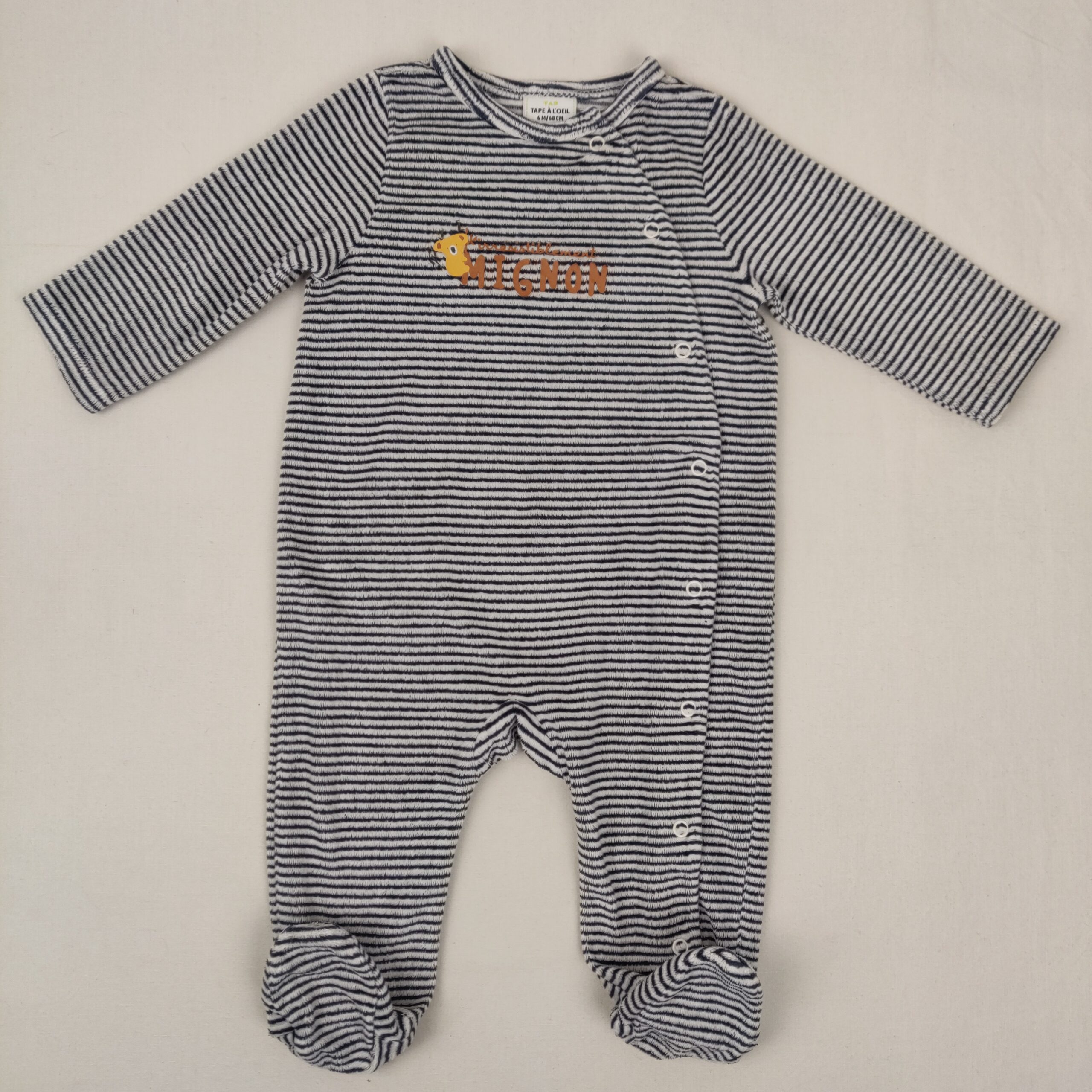 Autres commentaires : Pyjama en polaire, avec pieds, à rayures noires. Boutons pression à gauche, du col au pied. Inscription marron « irrésistiblement mignon » devant avec un koala.
