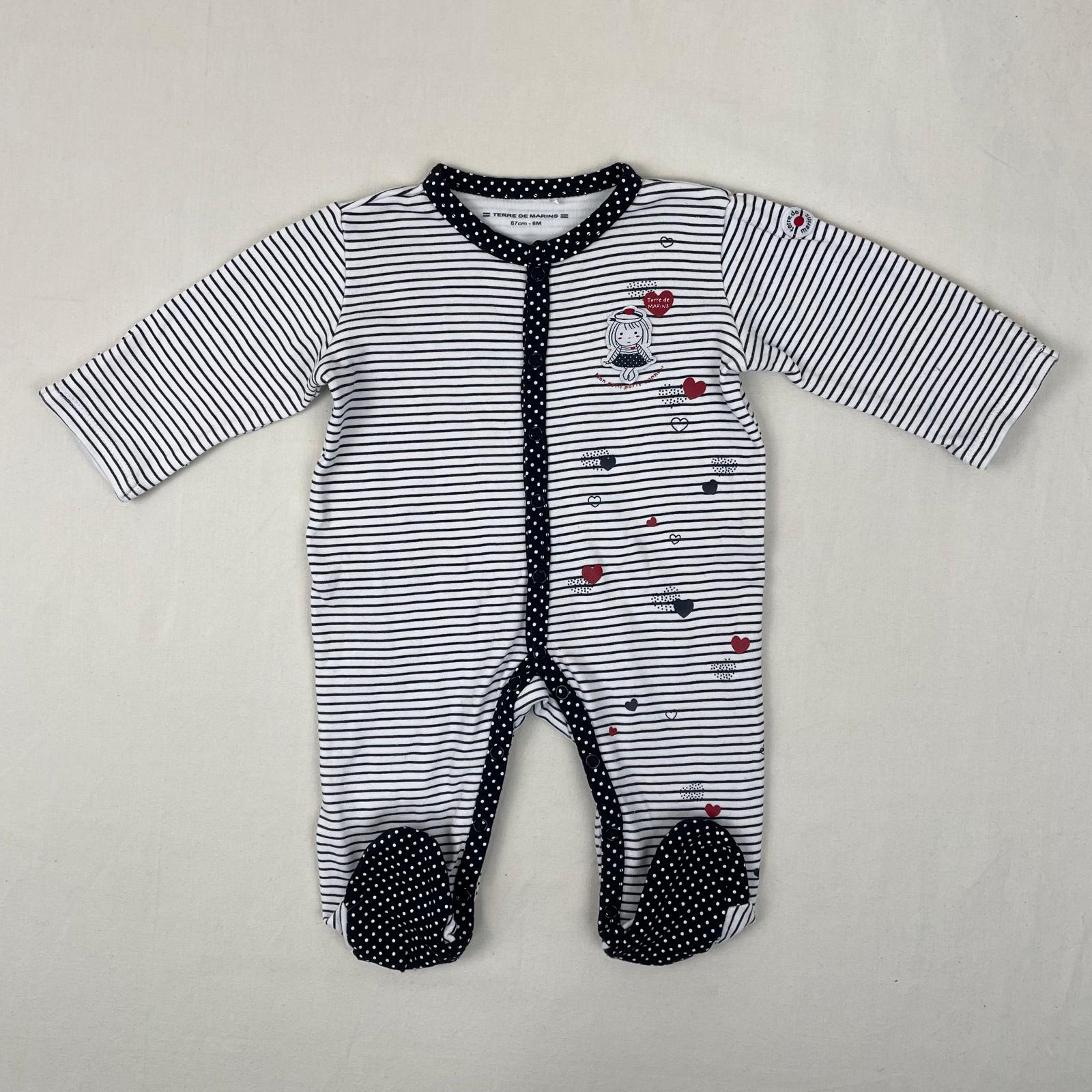 Autres commentaires : Pyjama une pièce rayé style marinière avec bordures bleu marine à pois blancs. Fermeture par boutons-pression à l’avant, à l’entrejambe et sur les pieds. Petits écussons décoratifs, motifs coeur et inscription « Terre de Marins ».`