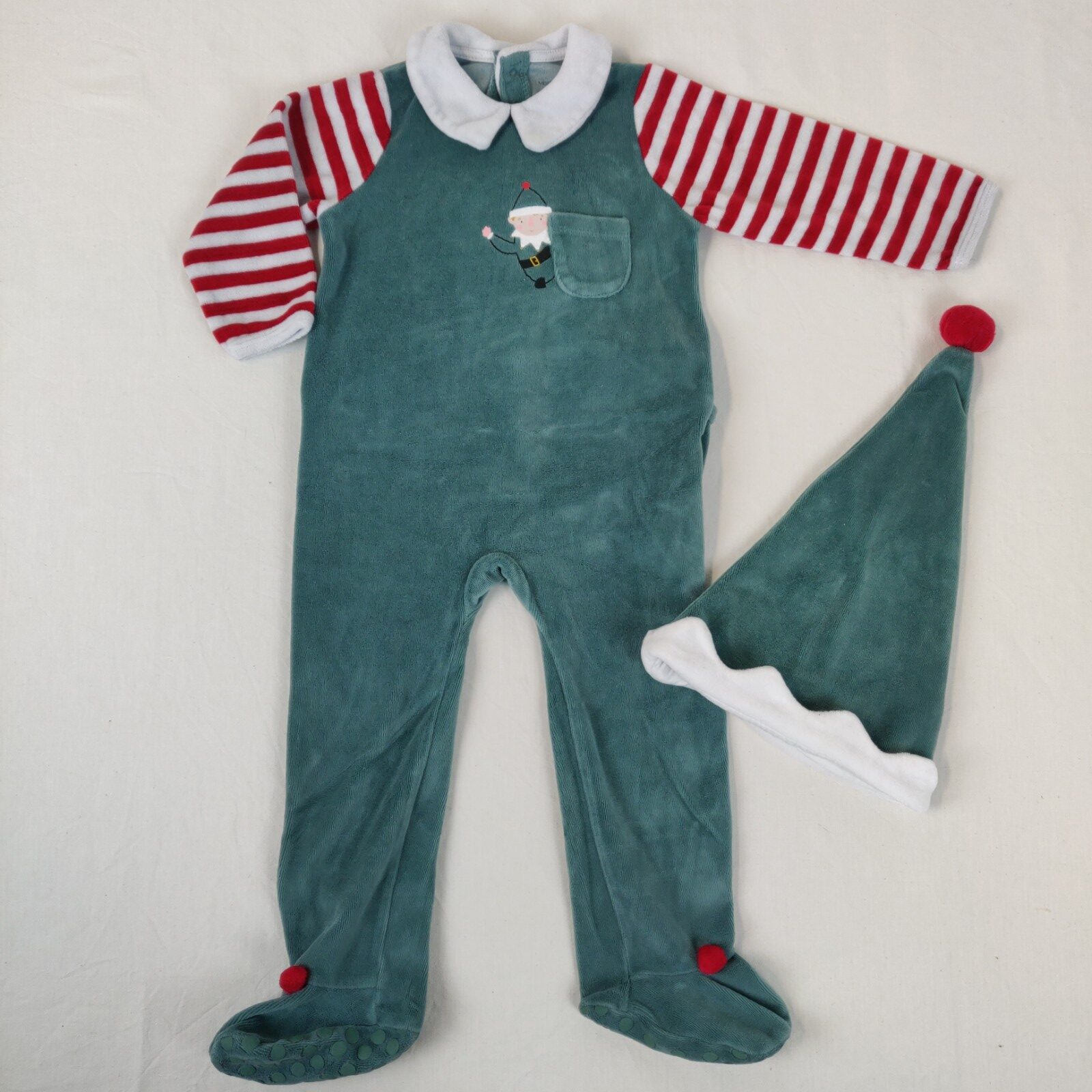 Autres commentaires : 25% polyester. Pyjama 1 pièce DORS-BIEN petit lutin de noël à manches longues et à pieds – vert. Les manches sont rayées rouge et blanc. Col blanc. Pochette centrale ornée d’un motif petit lutin. Pompon rouge au niveau des pieds. Semelles antidérapantes. Ouverture pressionnée au dos. Le pyjama est accompagné d’un chapeau triangulaire de lutin vert avec au sommet un pompon rouge.