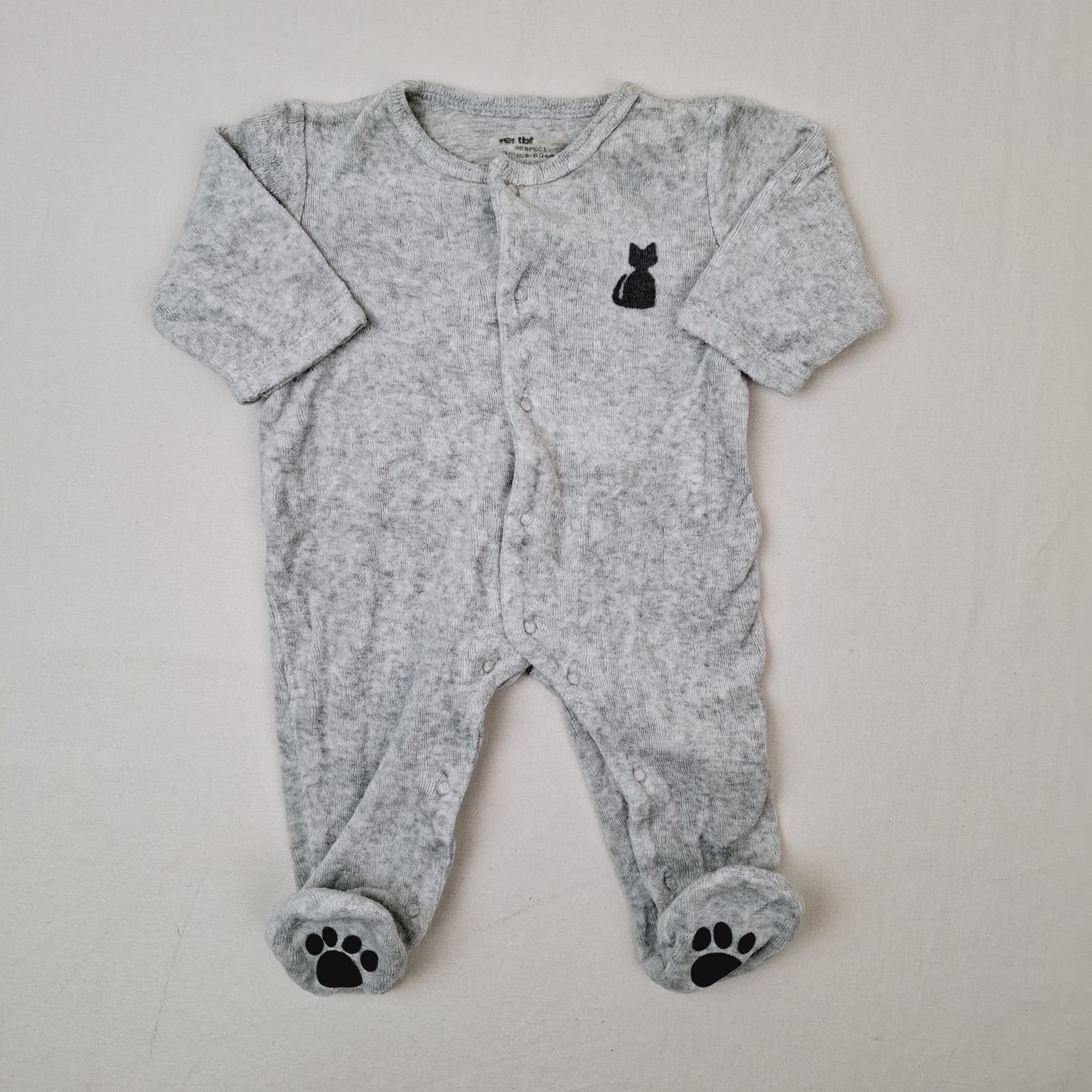 Autres commentaires : Pyjama dors-bien, en velours gris clair, devant motif silhouette de chat gris foncé, derrrière tête de chat au niveau du postérieur avec petites oreilles en relief, pieds avec pattes noires de chats antidérapantes, fermeture devant et à l’entrejambe par boutons pression.