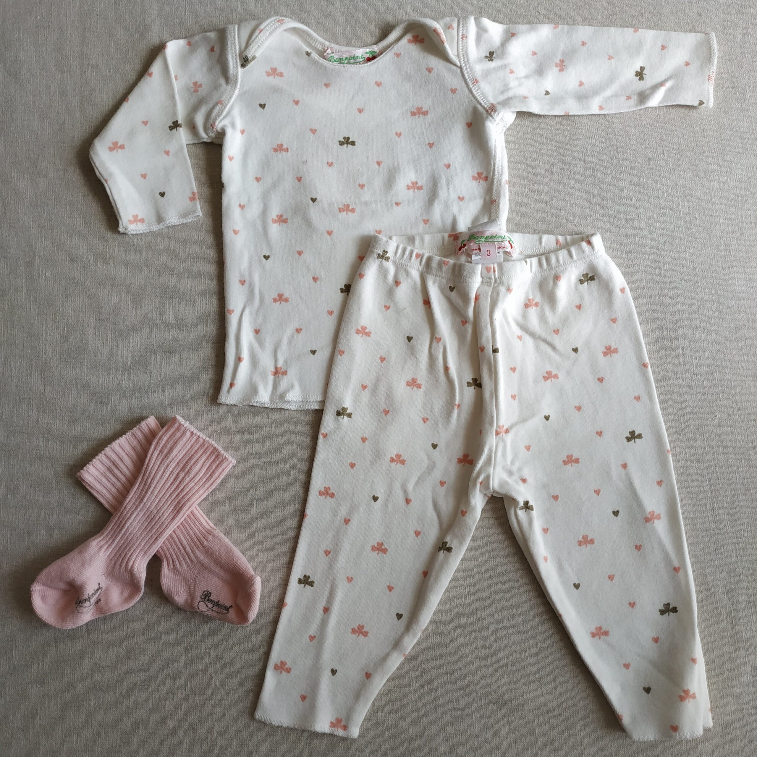 Autres commentaires : T-shirt manches longues et legging assorti, couleur écru, motif coeurs et trèfles vieux rose et kaki légèrement pailleté. Avec chaussettes roses