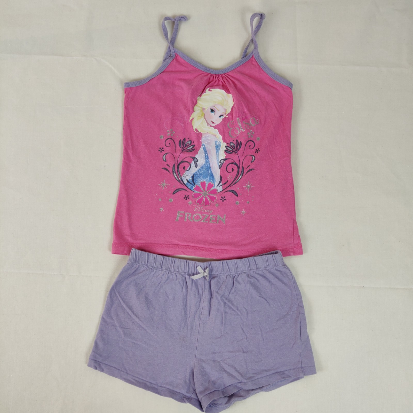 Autres commentaires : Pyjama en deux parties : débardeur – rose motif « La Reine des neiges ». Shorty – parme avec noeud décoratif central – taille élastique. Usure normale du vêtement.