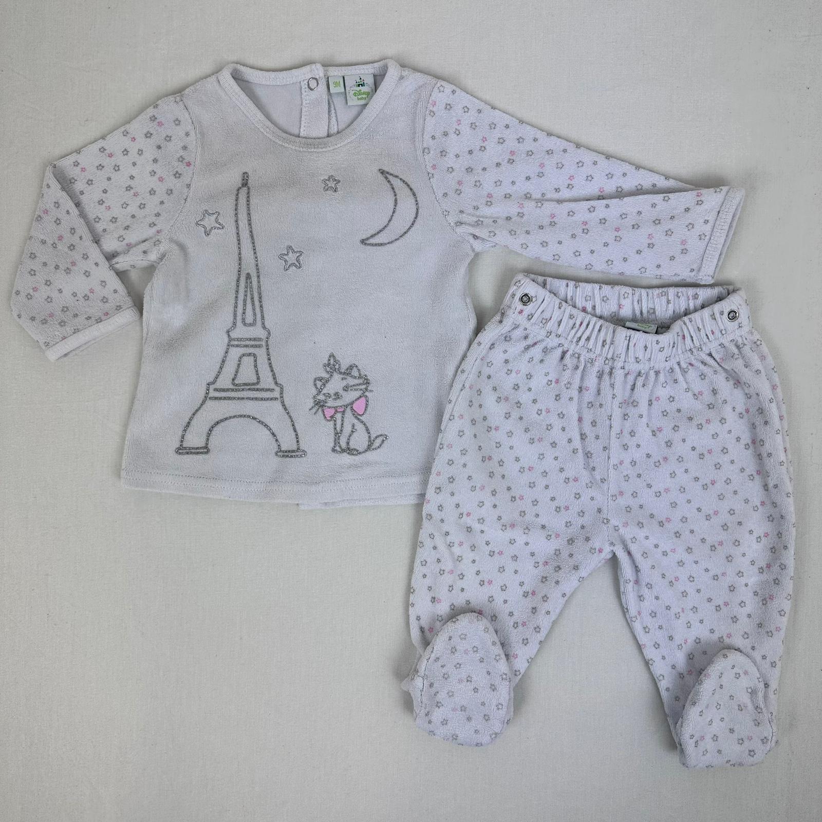 Autres commentaires : 26% polyester. Pyjamas 2 piéces: T-shirt manches longues blanc avec manches étoilées rouge et noir et une fermeture au dos par boutons pressions. Pantalon legging à pieds avec taille élastiquée.