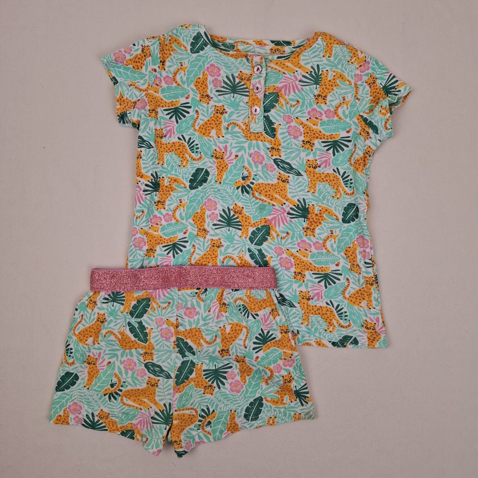 Autres commentaires : Pyjama 2 pièces blanc et turquoise imprimé tropical et léopard, effet côtelé : -T-shirt à manches courtes, col rond fermé devant par boutons – Short, large taille élastiquée à paillettes rosées.