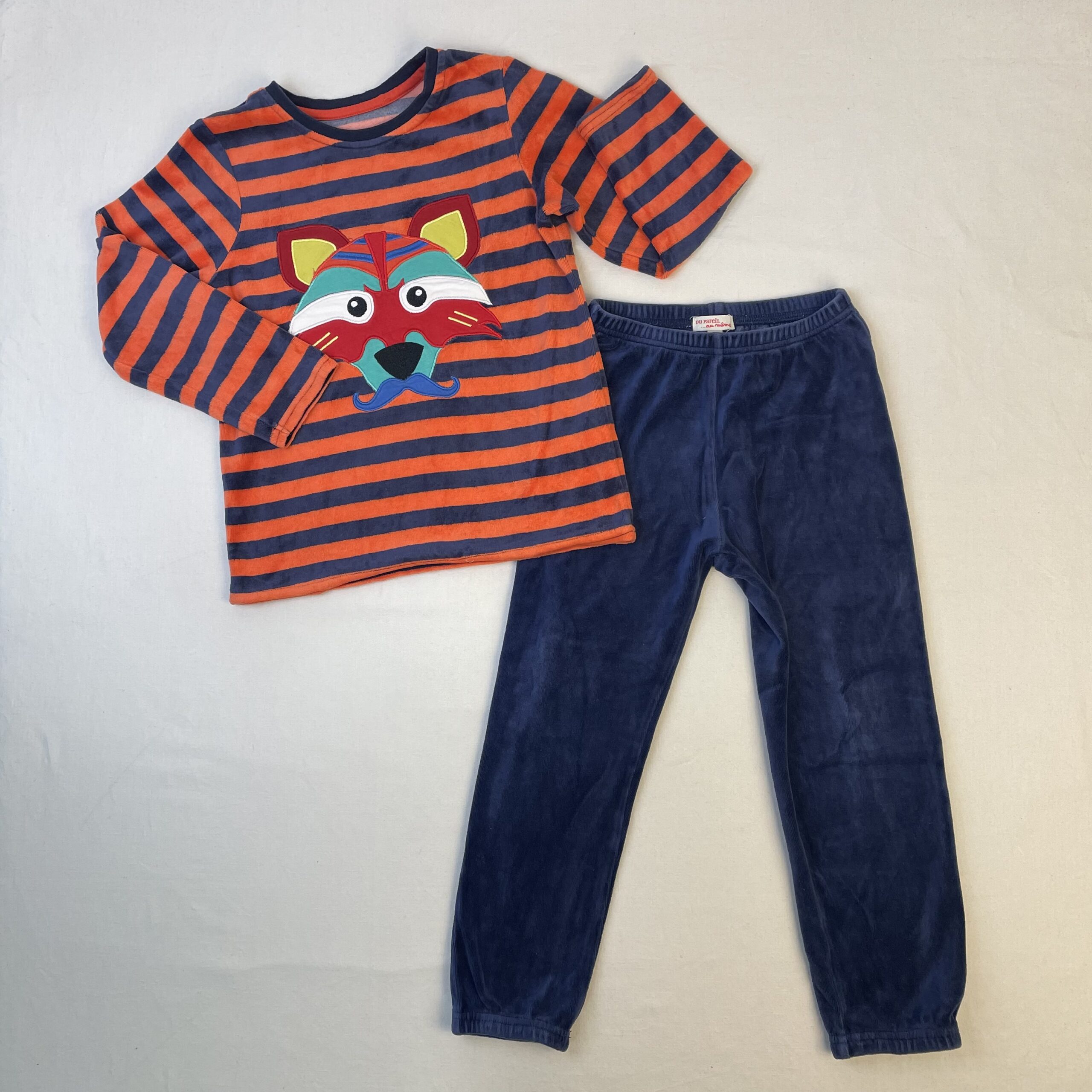 - Pyjama en velours à manches longues bleu foncé avec des rayures orange et un motif de raton laveur multicolore avec une moustache