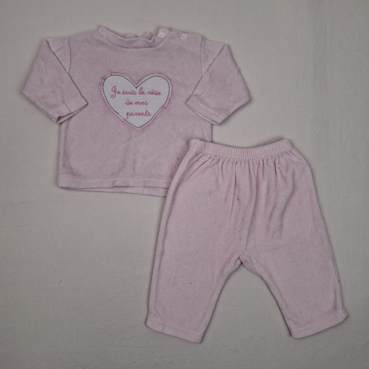 Autres commentaires : Pyjama 2 pièces rose, de Fruit de ma passion, le haut a un col rond avec des boutons a pression sur le coté gauche du col, on retrouve l’inscription « je suis le rêve de mes parents » brodé à l’avant du vêtement.