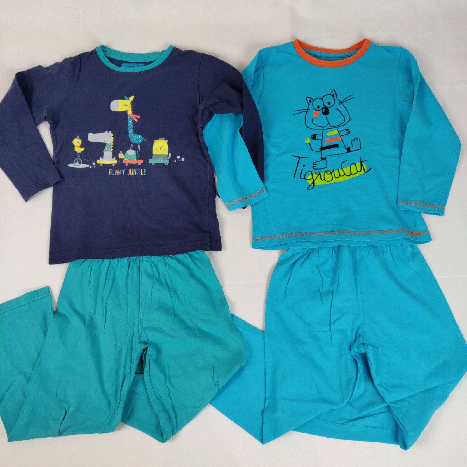 Autres commentaires : Lot de 2 pyjamas deux pièces. Haut à manches longues et pantalon à taille élastique. Pyjama 1 : Haut bleu avec motif chart noir orange et jaune et inscription « Tigroucat ». Col orange. Pantalon assorti. Pyjama 2 : Haut bleu foncé avec motifs animaux variés et multicolores en fil indienne et inscription « funny jungle ». Col bleu clair. Pantalon assorti à la couleur du col. Très discrète tâche marron à l’arrière du pantalon.