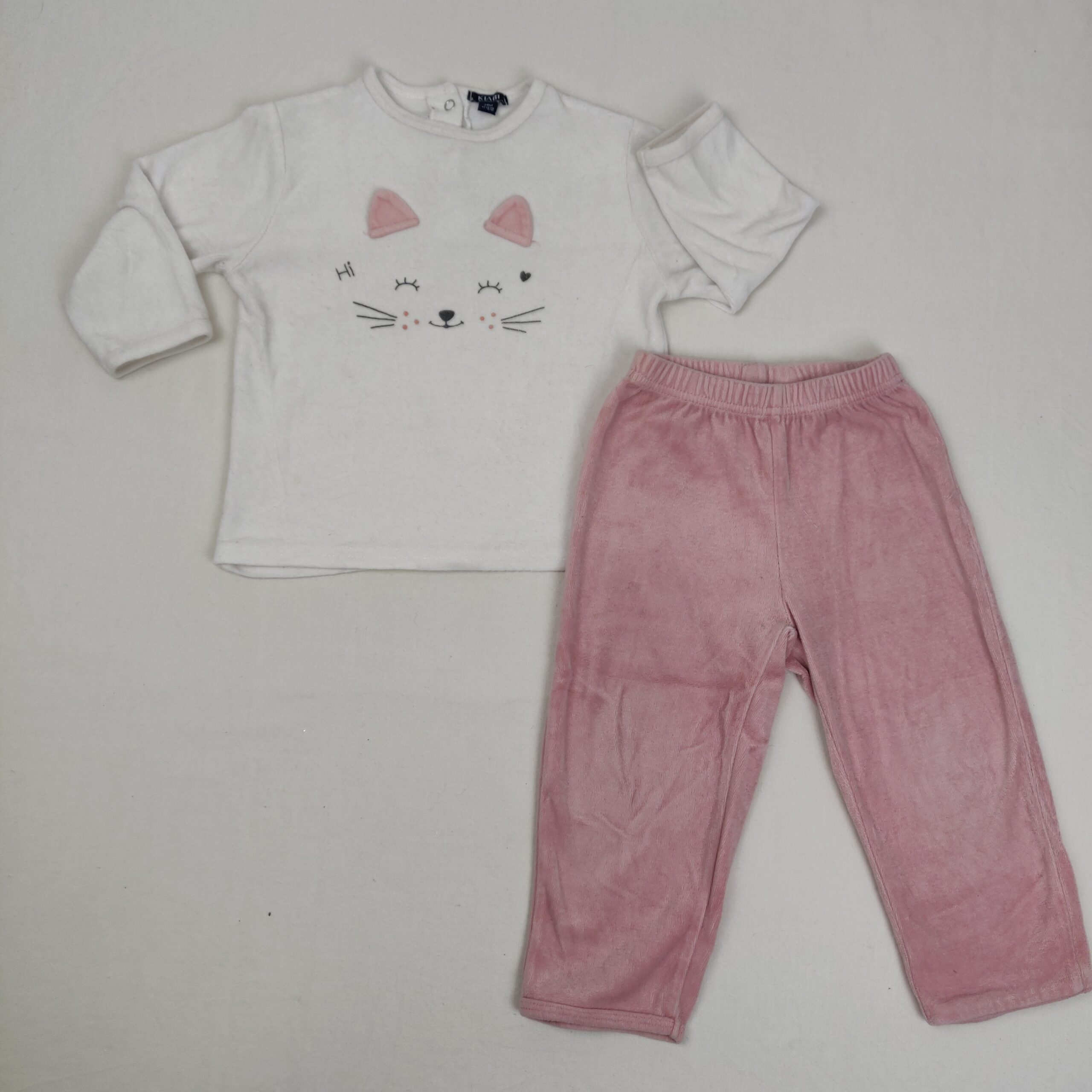 Autres commentaires : 25% polyester – Pyjama 2 pièces en velours dont 1 haut manches longues blanc motif tête de chat à oreilles rose pâle en relief, col rond, fermeture par boutons pression en haut du dos, languettes intérieures pour solidariser par boutons pressions les 2 parties du pyjama, et 1 bas en velours uni rose pâle, ceinture et chevilles élastiquées.