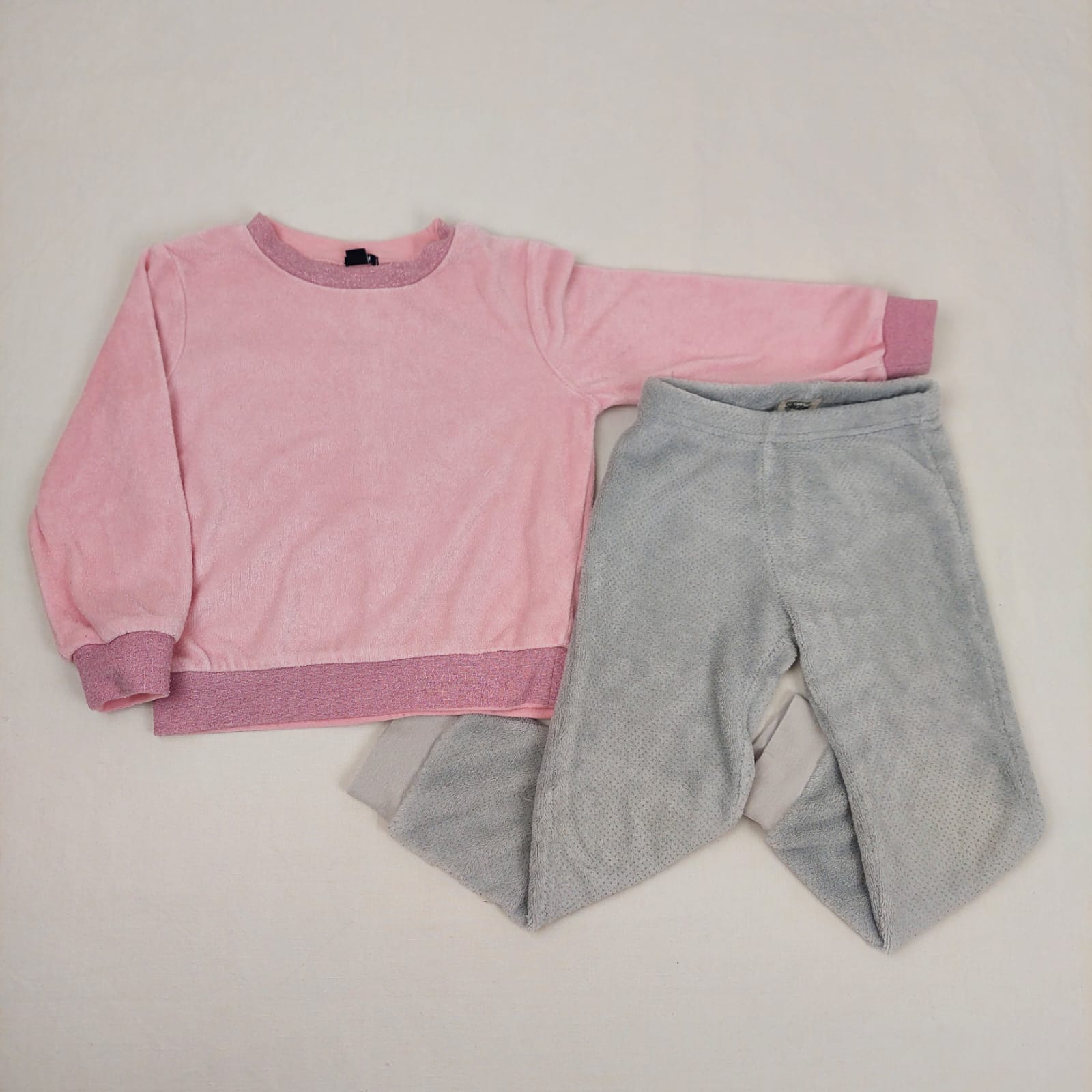 Autres commentaires : Pyjama ou tenue d’intérieur dépareillée, haut Kiabi 80% coton avec boutons décoratifs à l’arrière, bas Sincère gris à pois argentés en polaire très douce – quelques fils tirés.