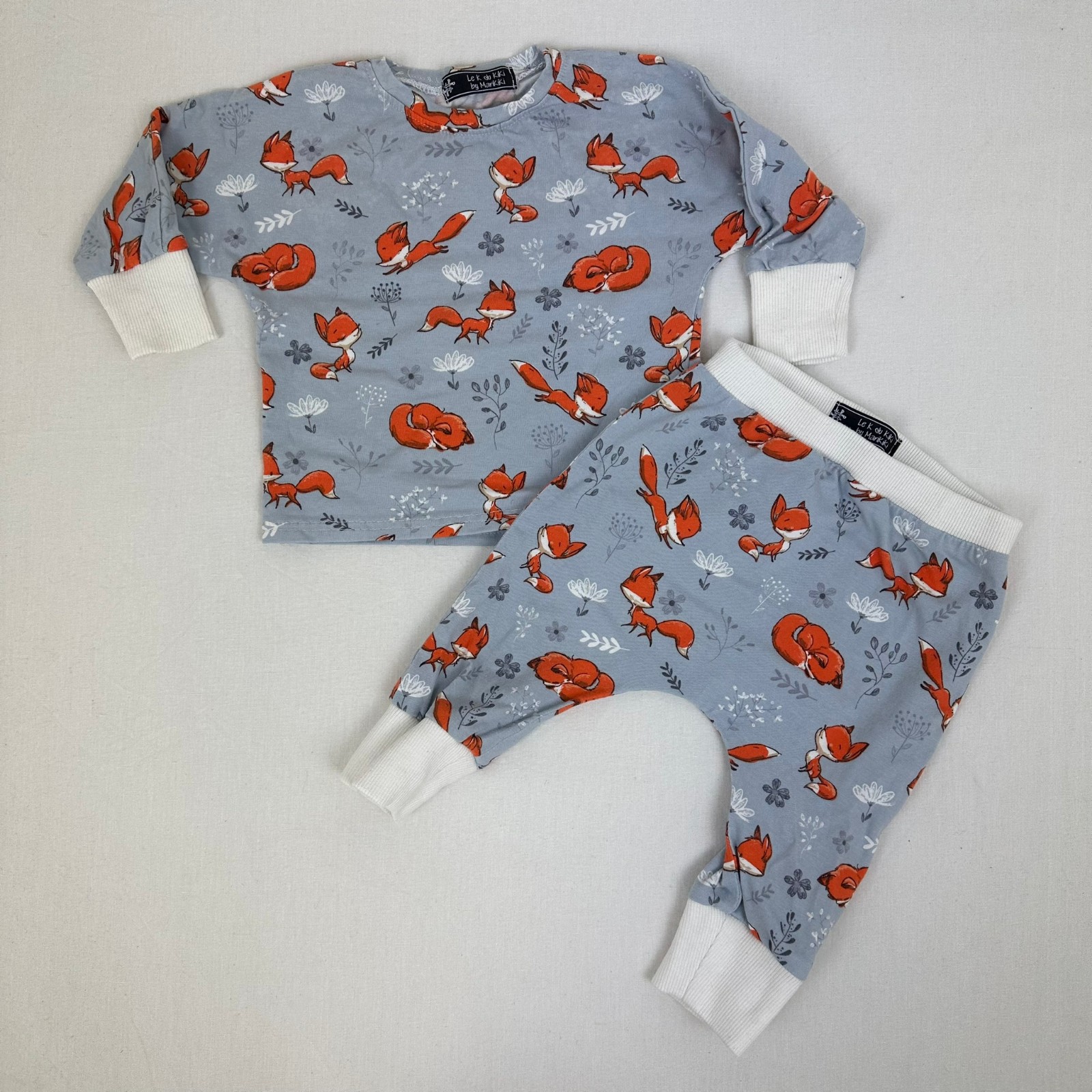 Autres commentaires : Taille éstimée: 12 mois Pyjama 2 pièces bleu manches longue et un pantalon jogging avec motif d’ensemble un renard et dessin petit bout de bois blanc.