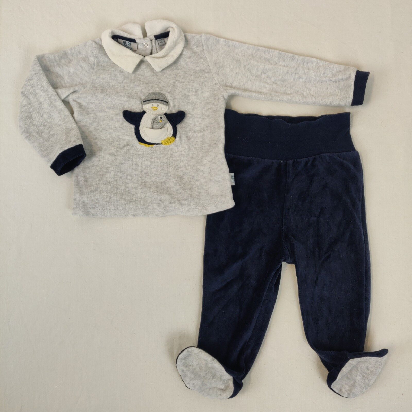 Autres commentaires : 20% polyester. Pyjama 2 pièces en velours. Haut à manches longues et à col – gris chiné avec motif central pingouin. Ouverture centrale au dos pressionnée. Un pantalon à pieds – bleu marine. Taille haute élastique.