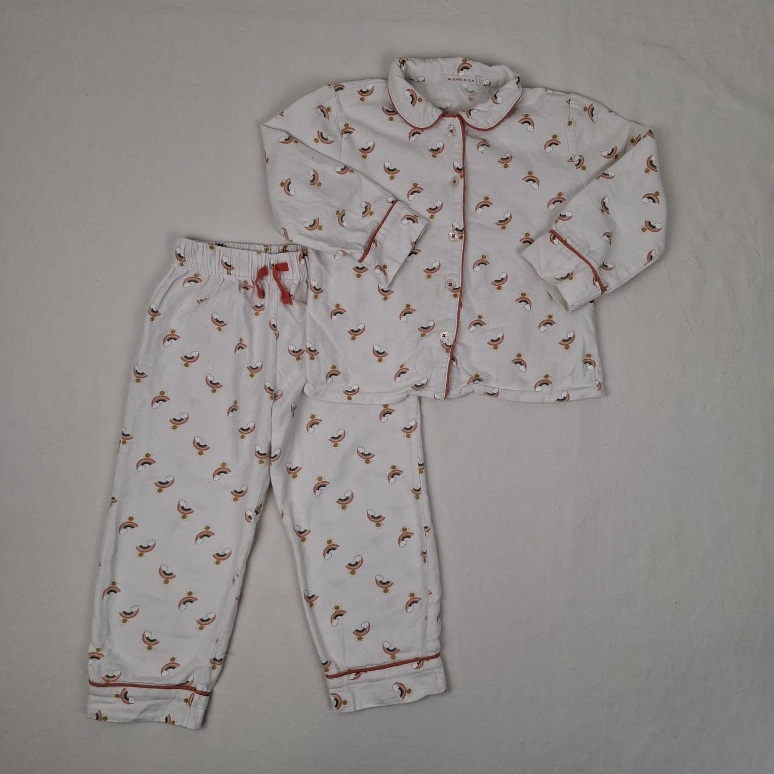 Autres commentaires : Pyjama 2 pièce blanc, chemise et pantalon, Monoprix kids, 4 ans, motifs arc-en-ciel sur tout le vêtement, finitions en rose