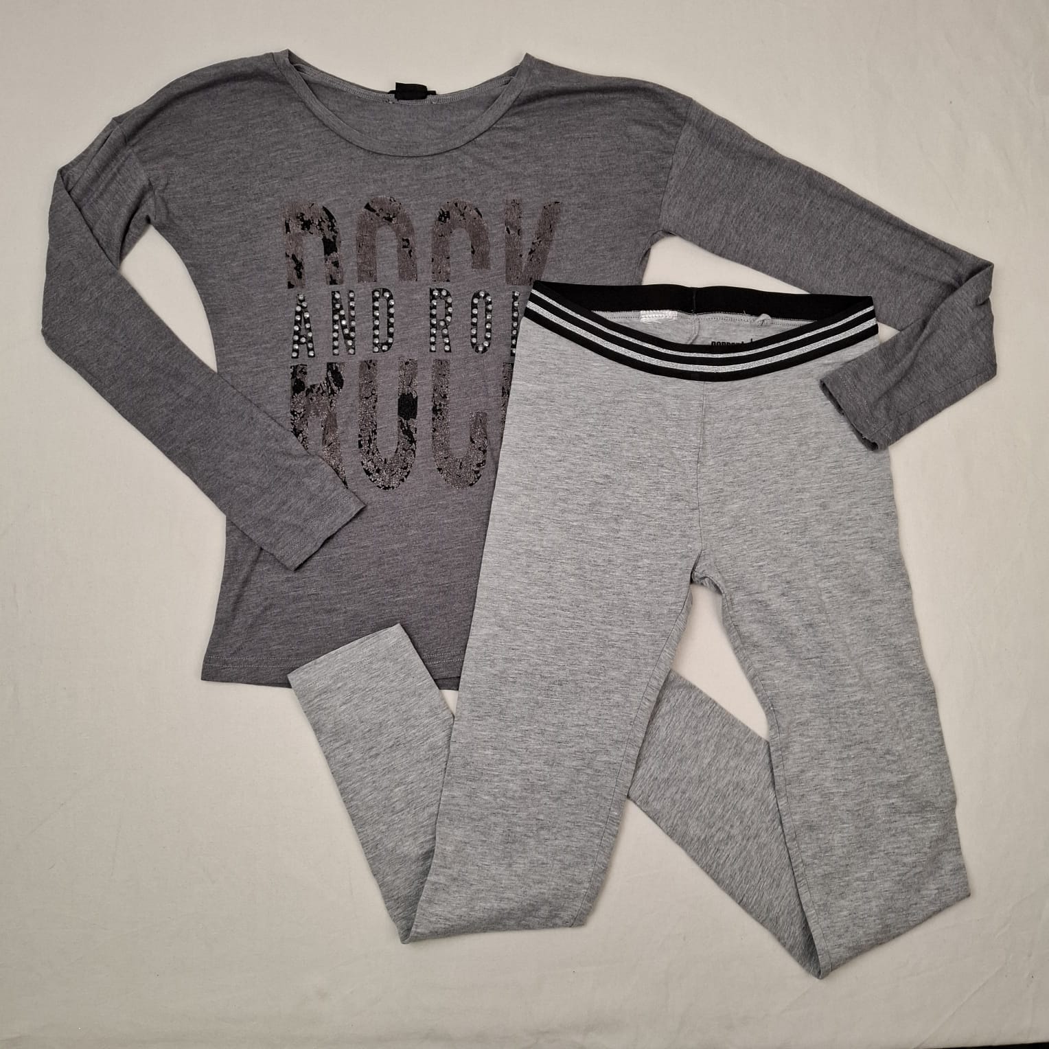 Autres commentaires : 35% viscose. Pyjama 2 pièces. – Pantalon Pepperts gris avec taille élastiquée. – Haut Jennyfer à manches longues avec une inscription « Rock ».
