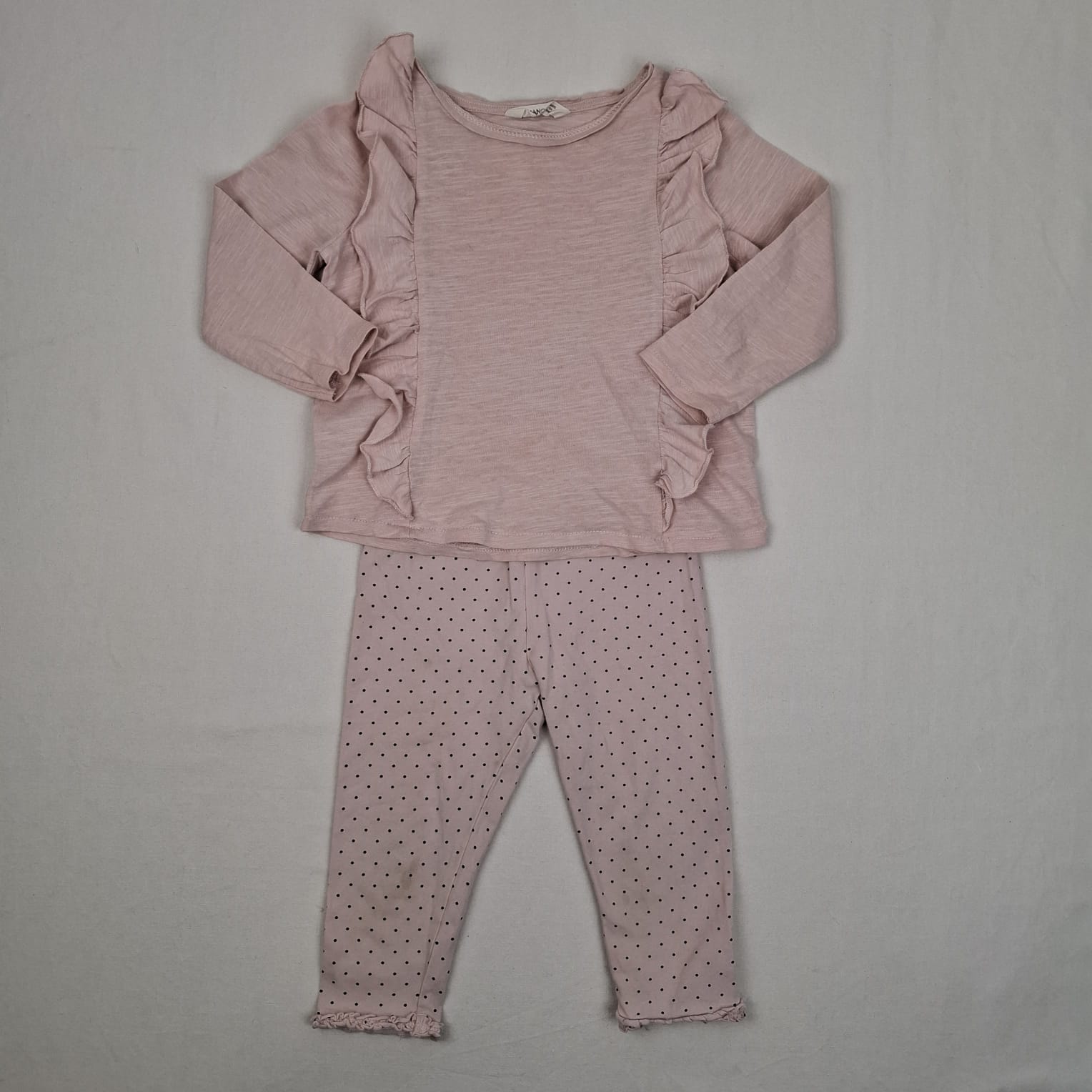 Autres commentaires : Pyjama 2 pièces léger 4A rose pâle à pois noirs composé d’un haut manches longues Mango et d’un bas long H&M, taille élastiquée.