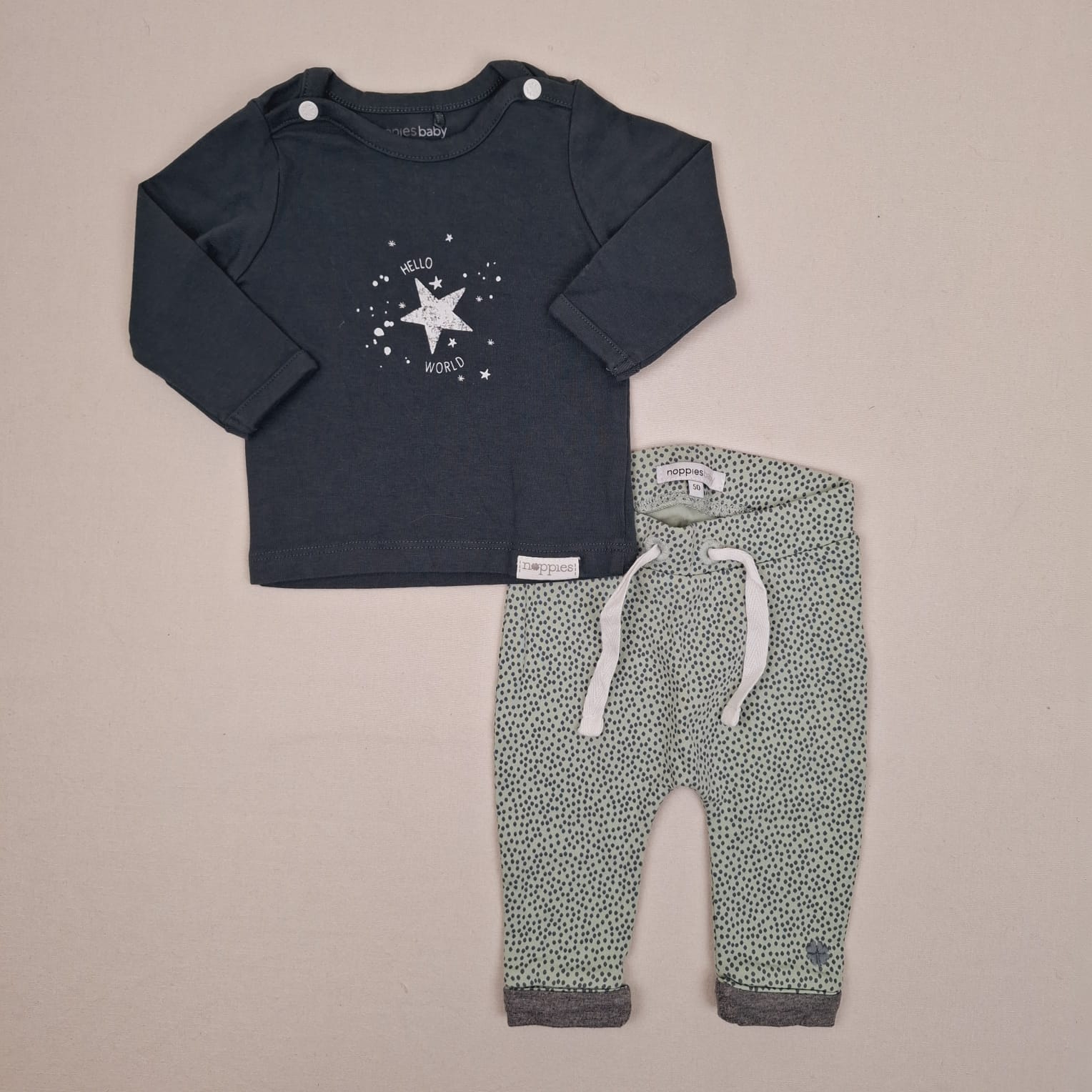 Autres commentaires : Pyjama 2 pièces vertes noppies 1M un haut manches longues vert foncés avec motifs étoiles et un bas vert claire à pois vert foncé taille élastiquée réglable avec lacet
