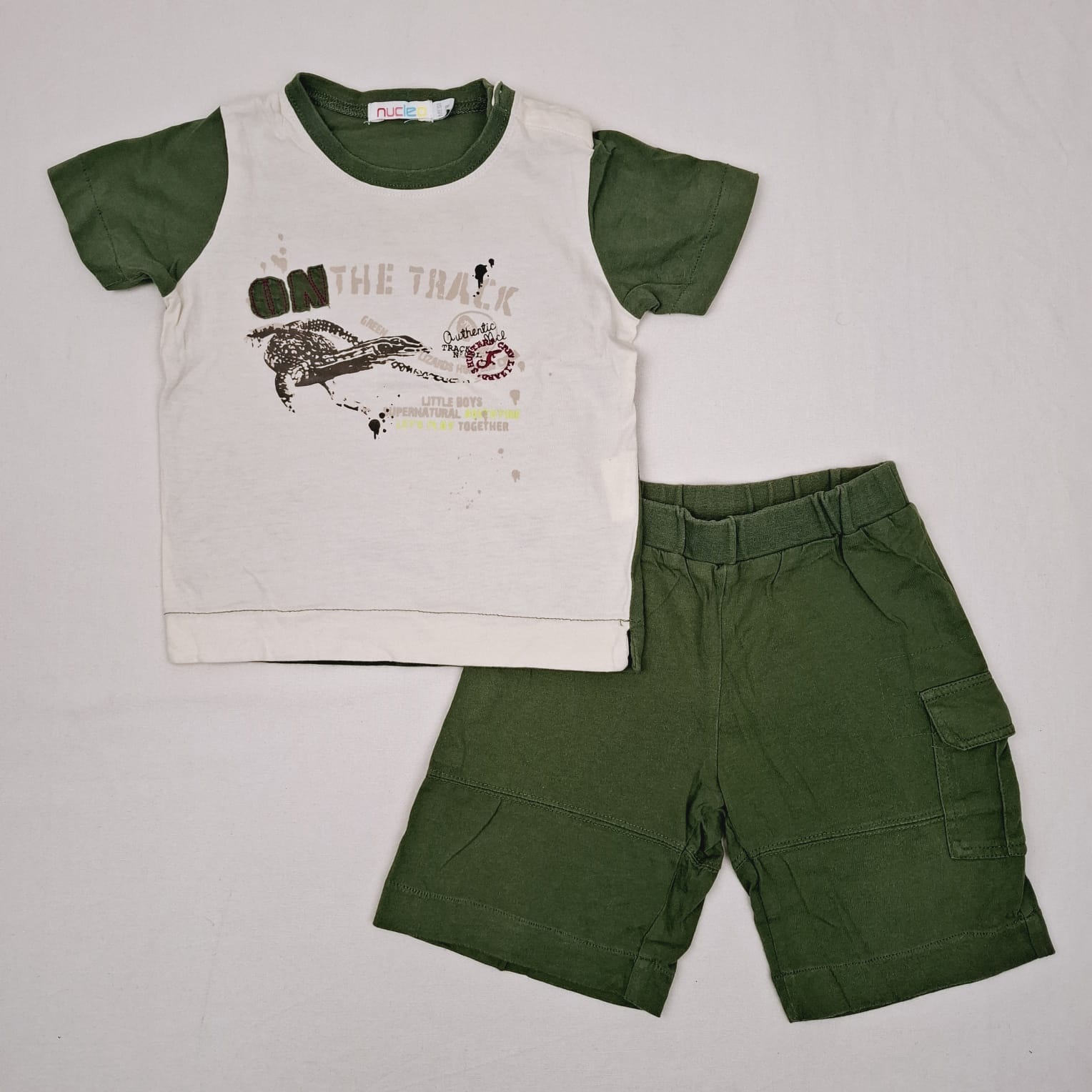 Autres commentaires : Pyjama 2 pièces : – Un short vert, taille élastique, Un t-shirt blanc et vert à manches courtes avec un motif de lézard, col rond
