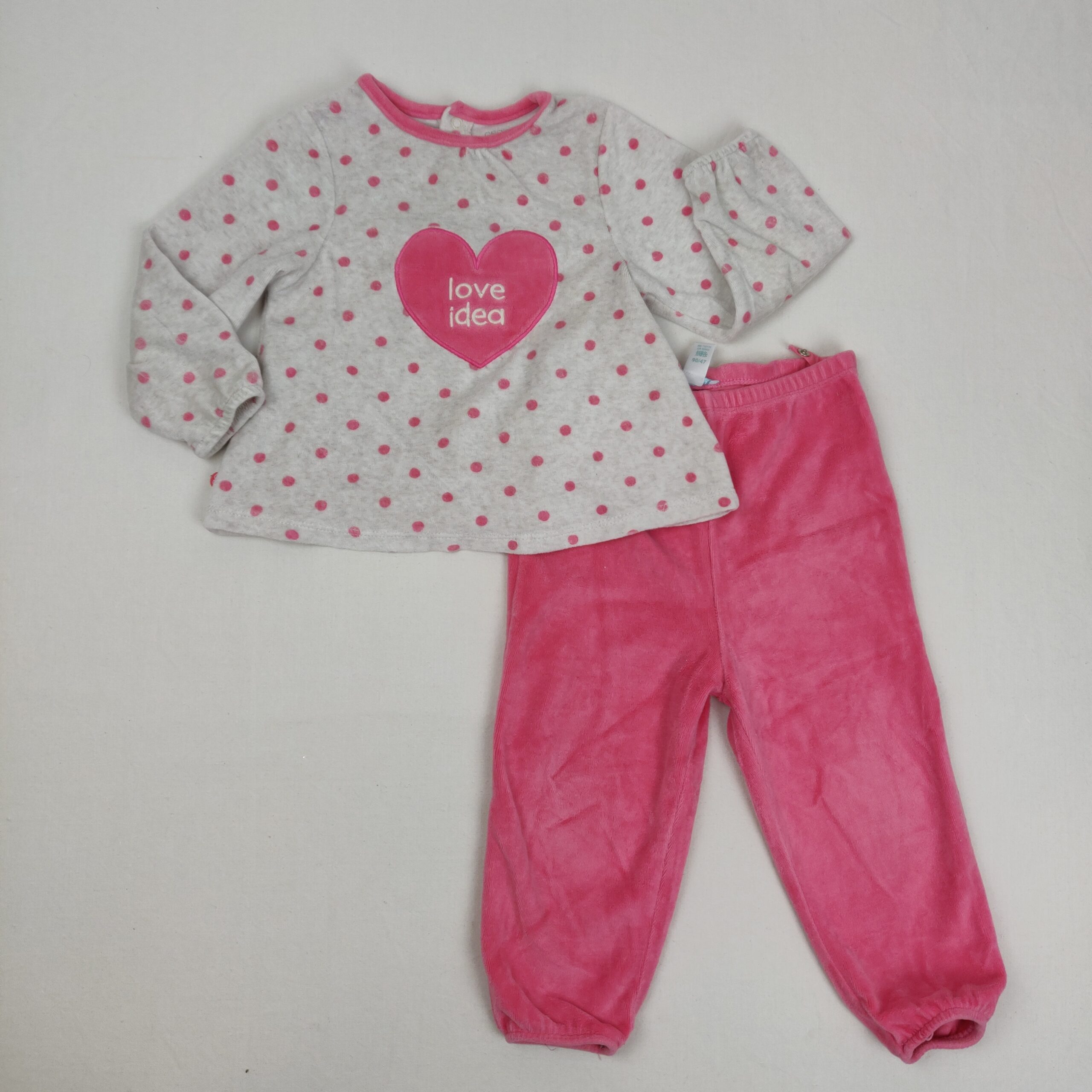 Autres commentaires : 20% polyester – Pyjama 2 pièces en velours dont 1 haut manches longues gris à pois rose bonbon, devant motif coeur rose bonbon avec l’inscription « Love idea », col rond avec liseré rose avec quelques fronces devant, fermeture par boutons pression dans le dos, languettes intérieures pour solidariser par boutons pressions les 2 parties du pyjama, et 1 bas en velours uni rose bonbon, ceinture et chevilles élastiquées.