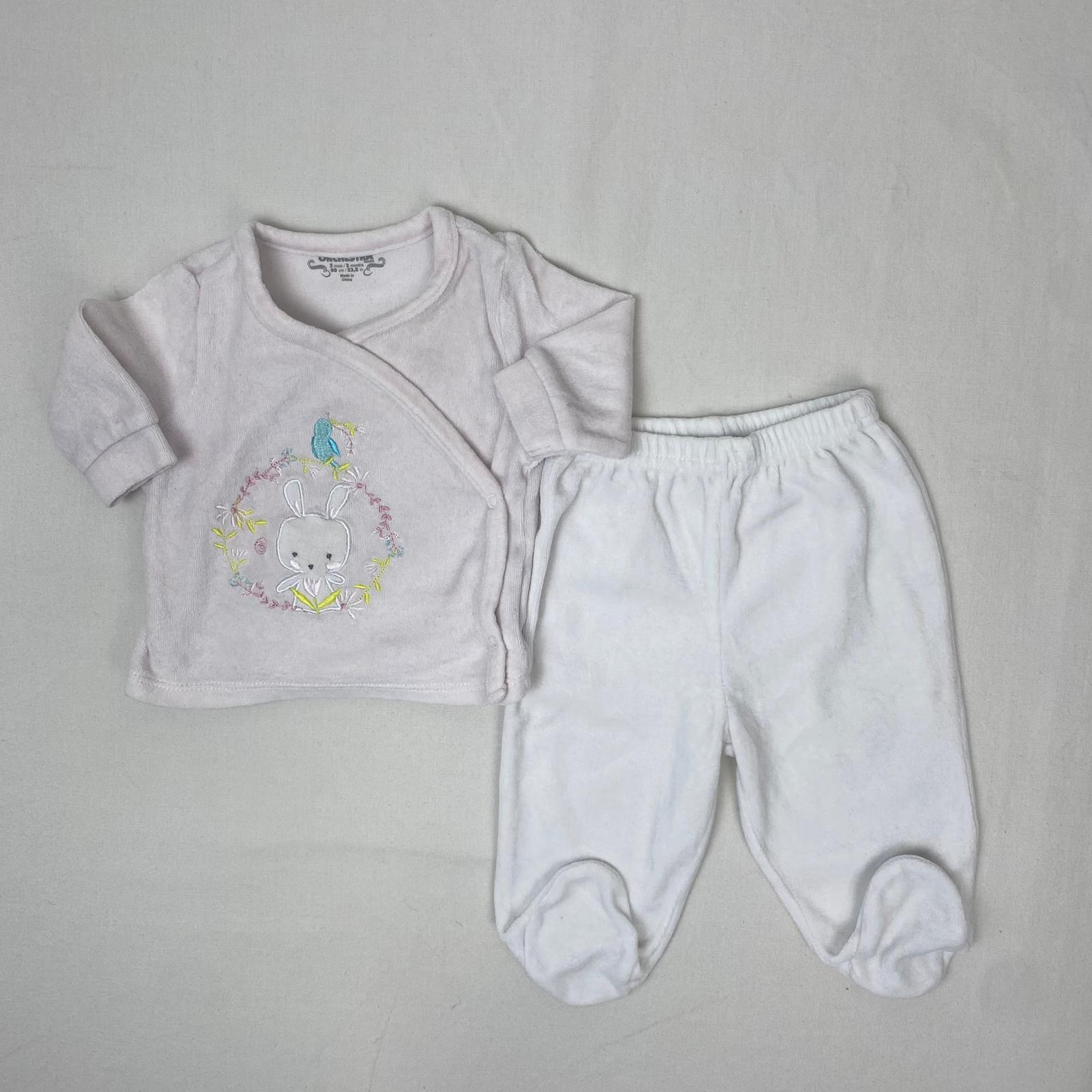 Autres commentaires : 20% polyester. Pyjama 2 pièces : – un pantalon blanc avec pieds. – un haut rose caramel croisé assorti avec motif renard. – Haut et bas pouvant se solidariser par boutons pression.