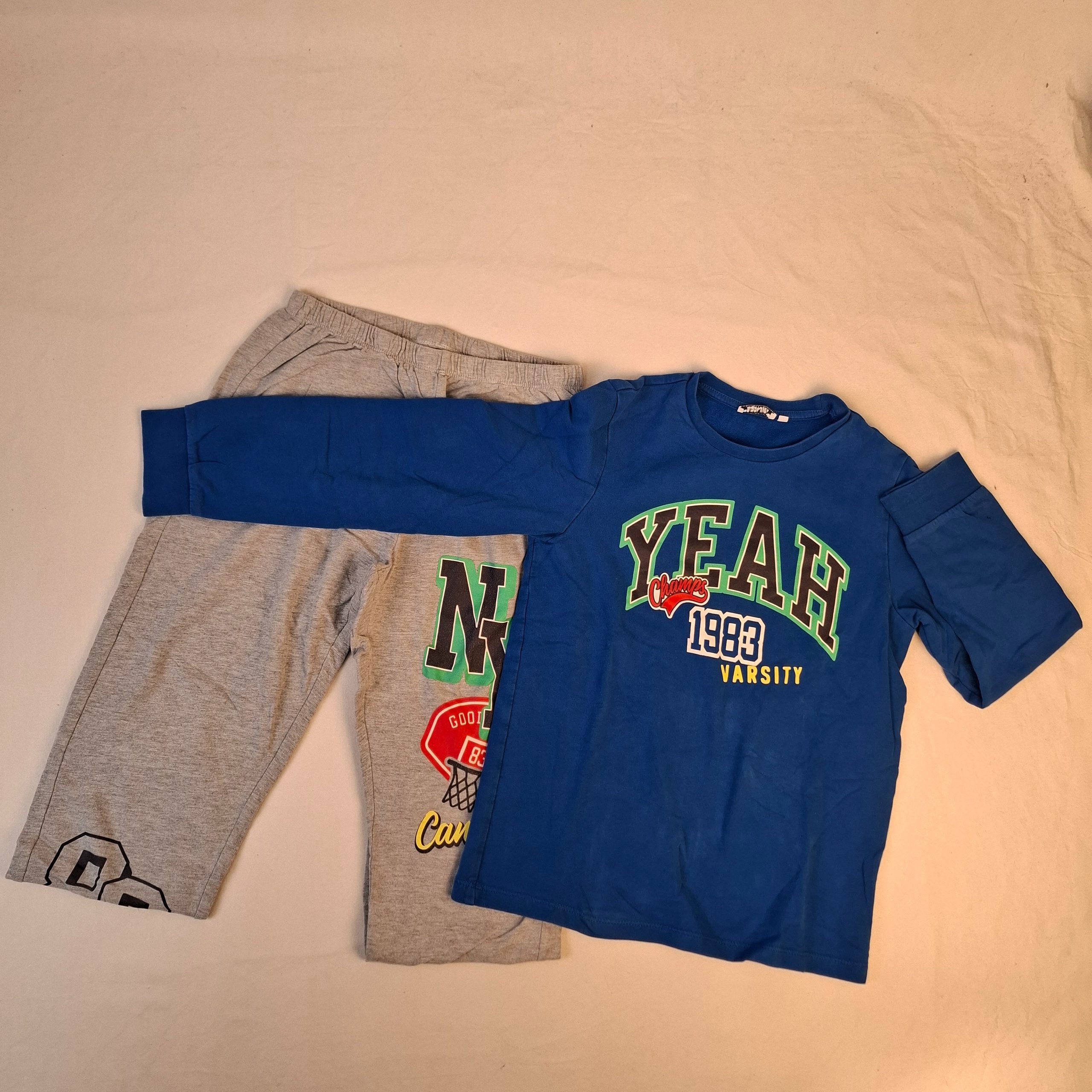 - Ensemble pyjama, un t-shirt à manches longues bleu et un pantalon gris