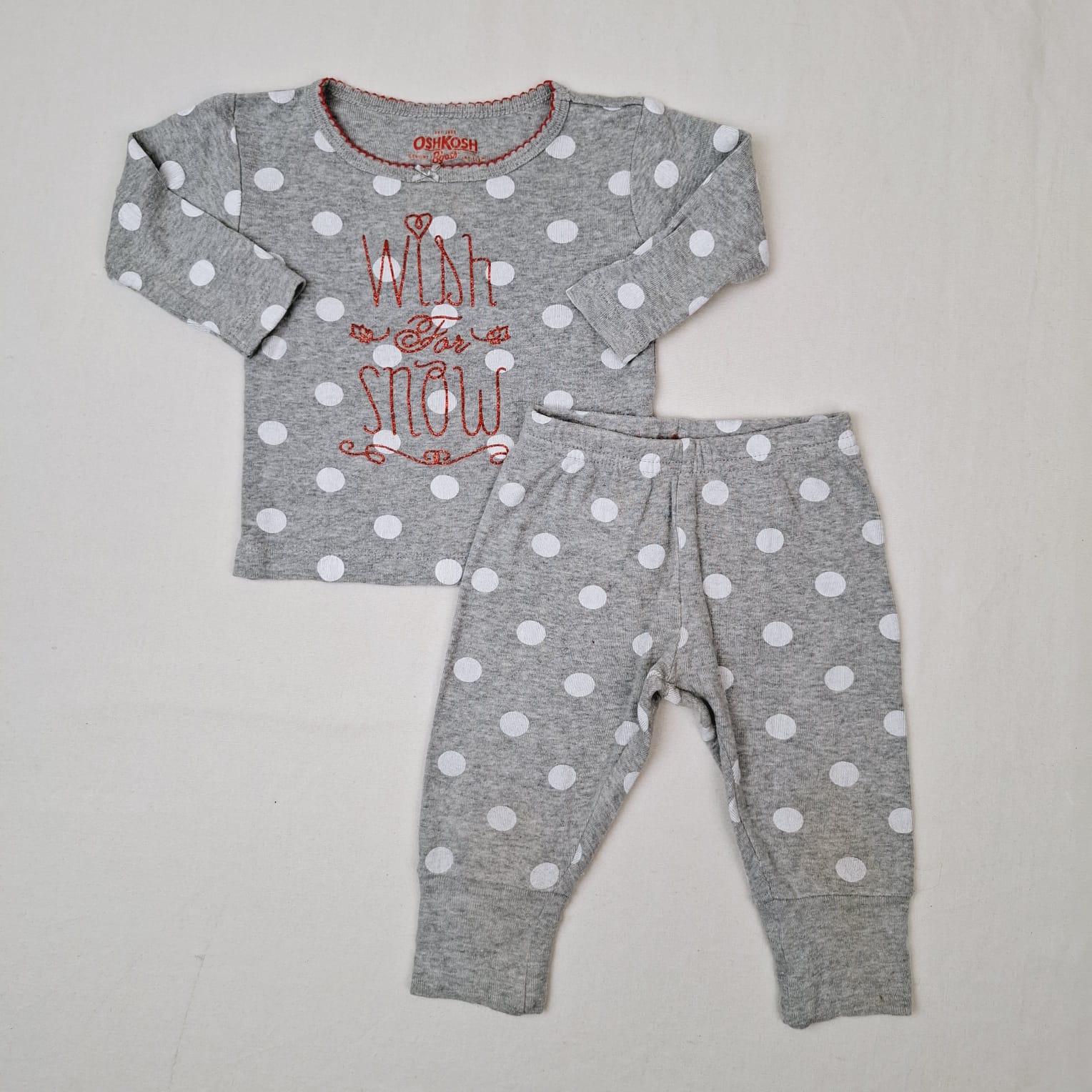 Autres commentaires : Pyjama gris à pois blancs 2 pièces : – T-shirt à manches longues, col rond. – Pantalon de jogging, taille élastique.