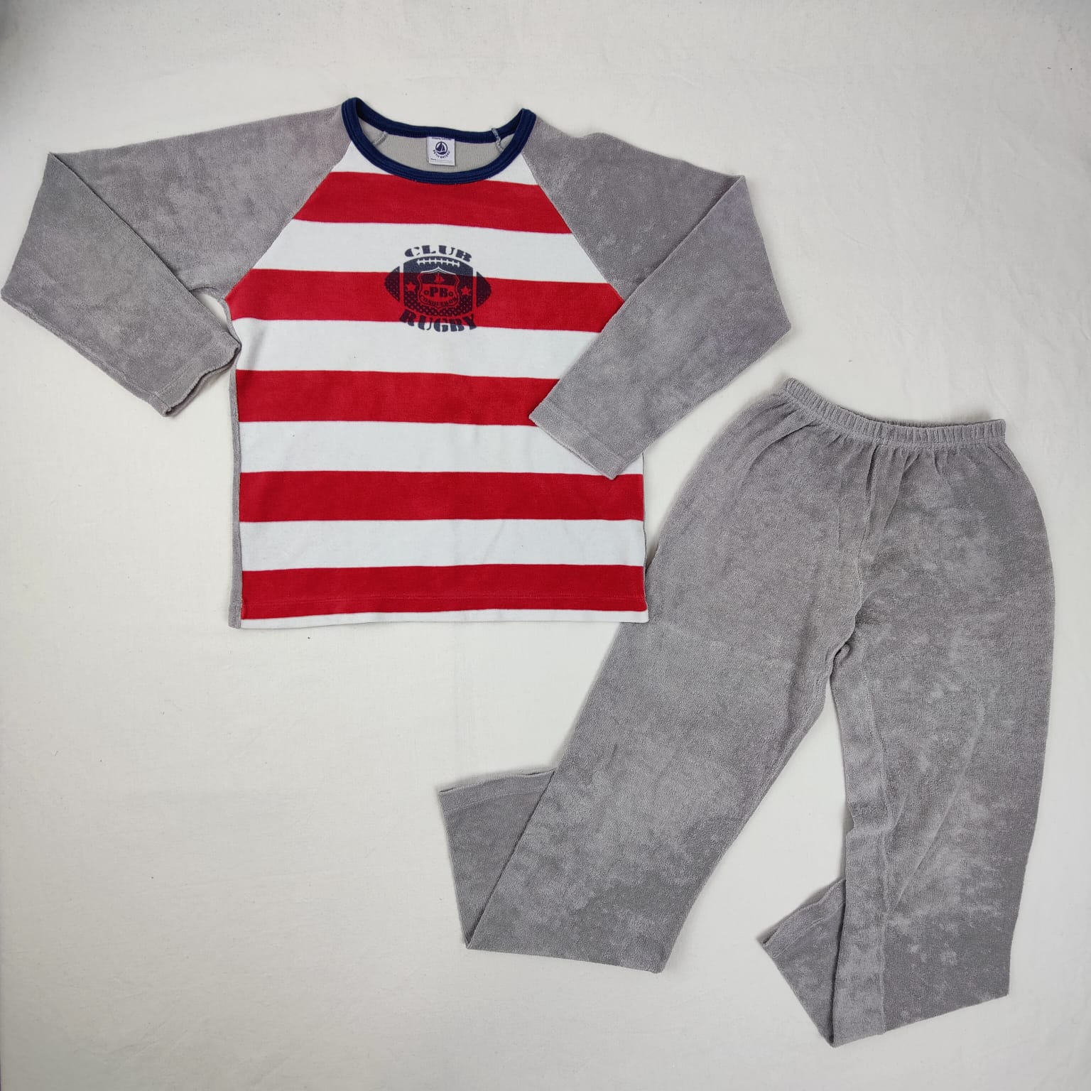Autres commentaires : 25% polyester, haut avant rayé rouge et blanc, imprimé rugby, dos gris, bas gris, très légèrement usé