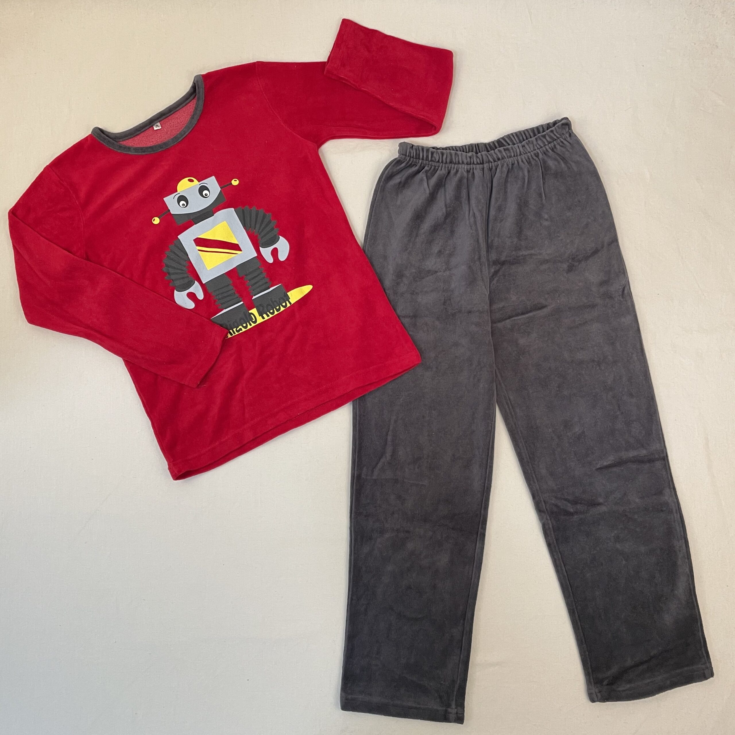 - Pyjama en velours en parfait état : – Haut manches longues rouge, devant motif robot gris et jaune avec inscription « Rigolo Robot ». – Pantalon gris, taille élastiquée.