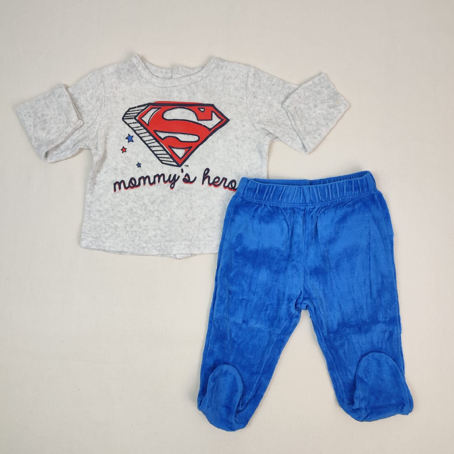 Autres commentaires : 25% polyester. Pyjama en velours : -T-shirt gris manches longues motif logo Superman et inscription » Mommy’s hero », fermeture par boutons pression au dos, petite tache sur manche gauche. – Pantalon bleu avec pieds, taille élastiquée.