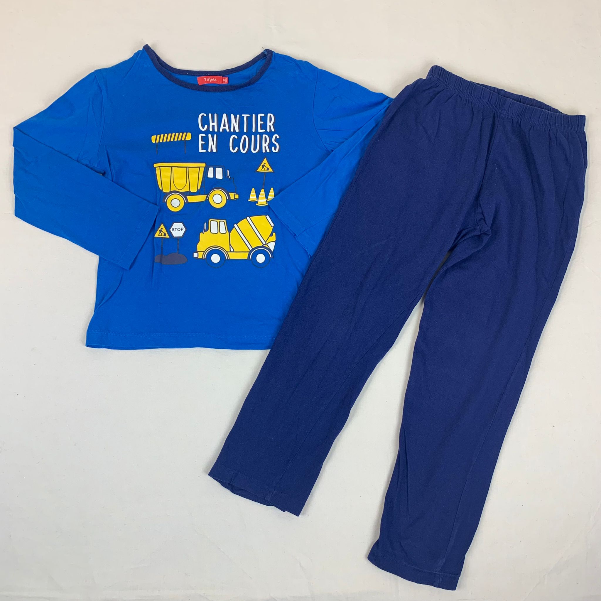Autres commentaires : T-shirt manches longues avec un motif jaune principal « un chantier en cours ». Leggins bleu avec taille élastiquée.