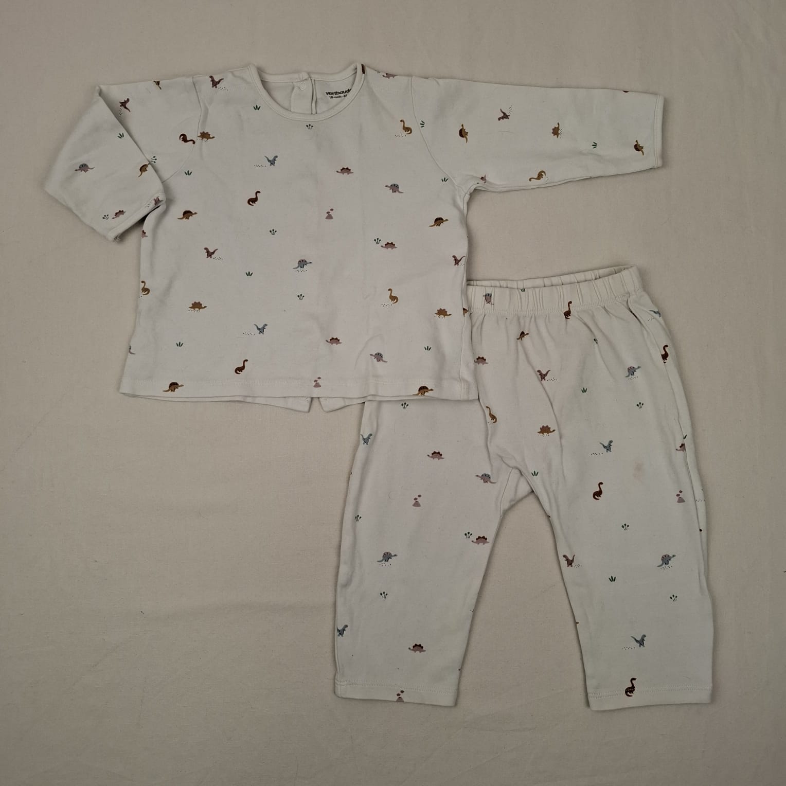 Autres commentaires : Pyjama 2 pièces, blanc cassé parsemé de mini dinosaures : – Haut manches longues, fermeture par boutons pression au dos, – Pantalon assorti, taille élastiquée, haut et bas solidarisables par boutons pression.
