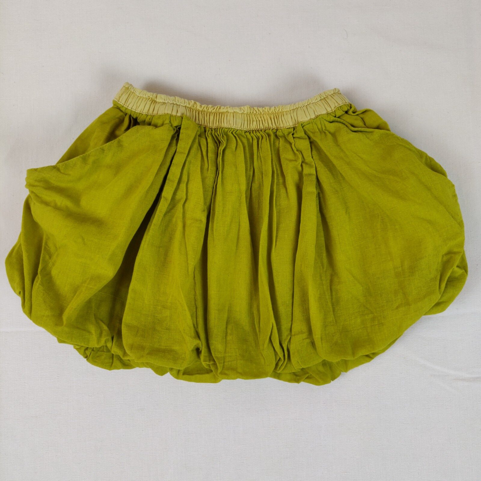 Autres commentaires : Jupe doublée – vert-jaune – taille élastique jaune pastel. Effet plissé et légèrement bouffant.