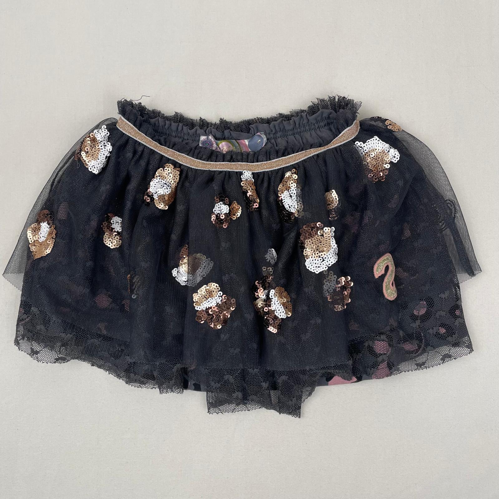 Autres commentaires : Jupe en tulle avec 2 couches : une à ocuers, l’autre à paillettes. Taille élastiquée. Doublure 100% coton à l’interieur à motifs léopard.