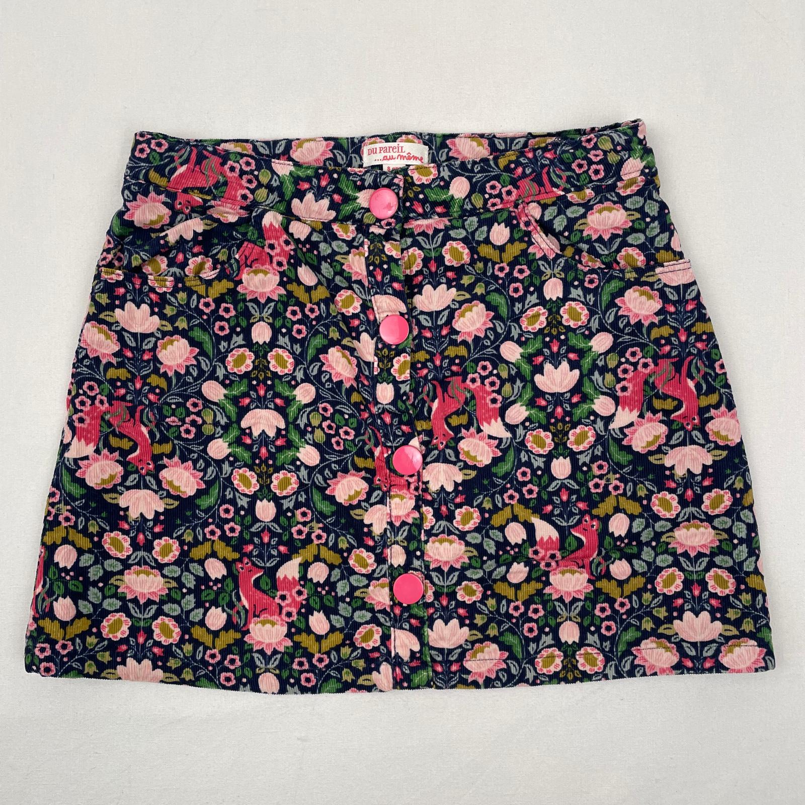Autres commentaires : Jupe en velours côtelé à imprimés fleurs et renard. Poches aux fesses et devant. Fermeture devant en boutons pression