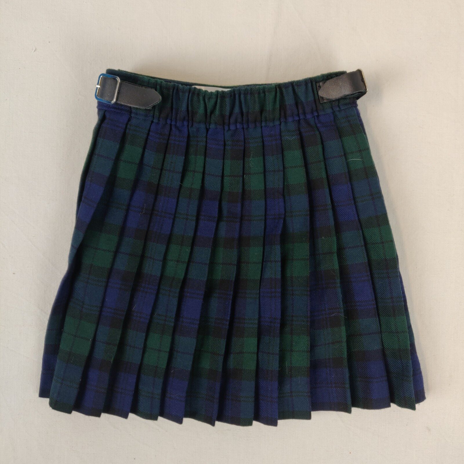 Autres commentaires : 35% viscose. Jupe esprit – Kilt ouverture portefeuille. Motif écossais bleu, vert et noir.