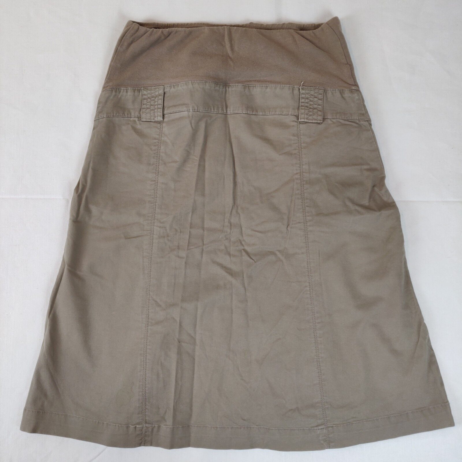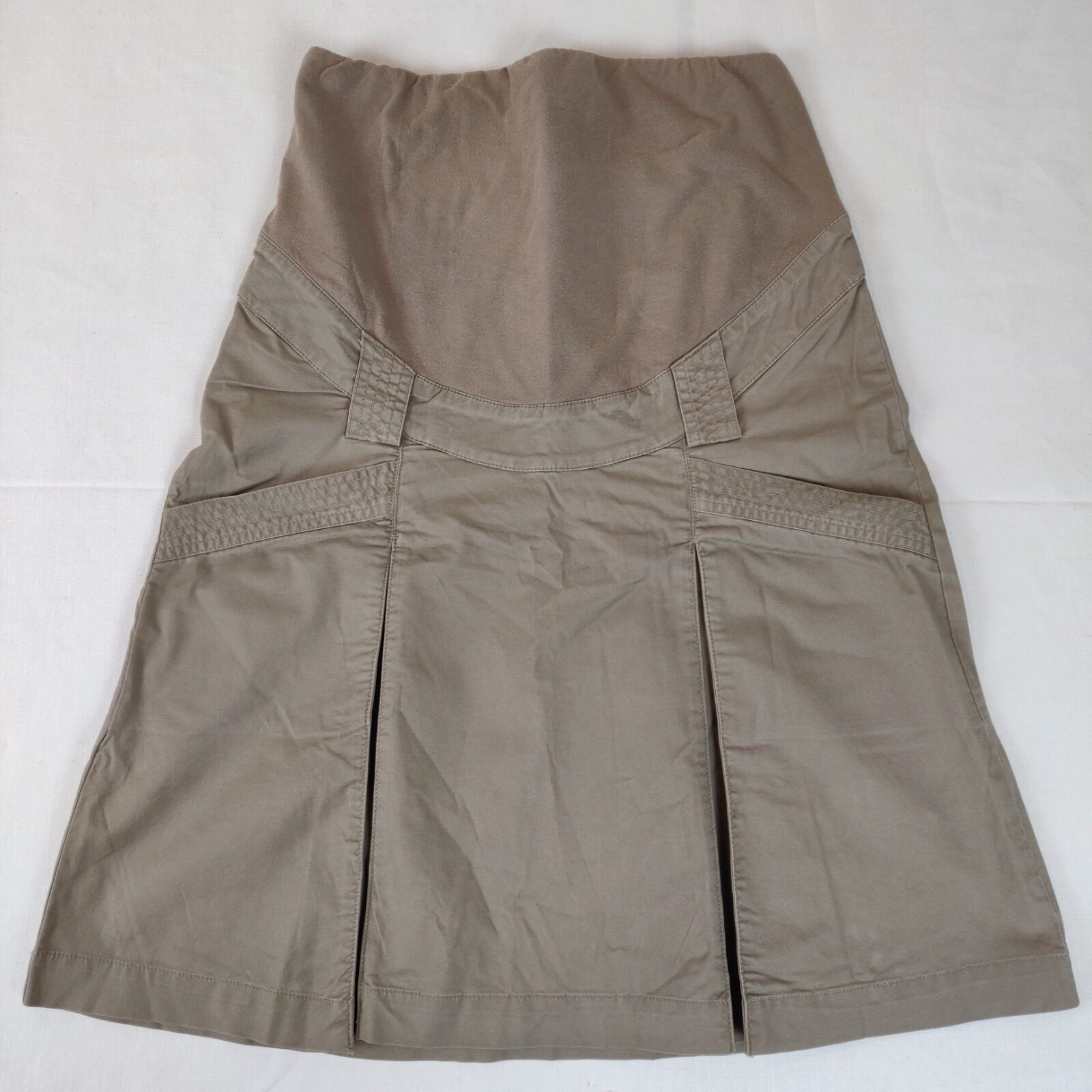 Autres commentaires : 5% spandex. Jupe couleur taupe, deux poches à l’avant et plis. Bandeau pour le ventre élastiqué en haut.