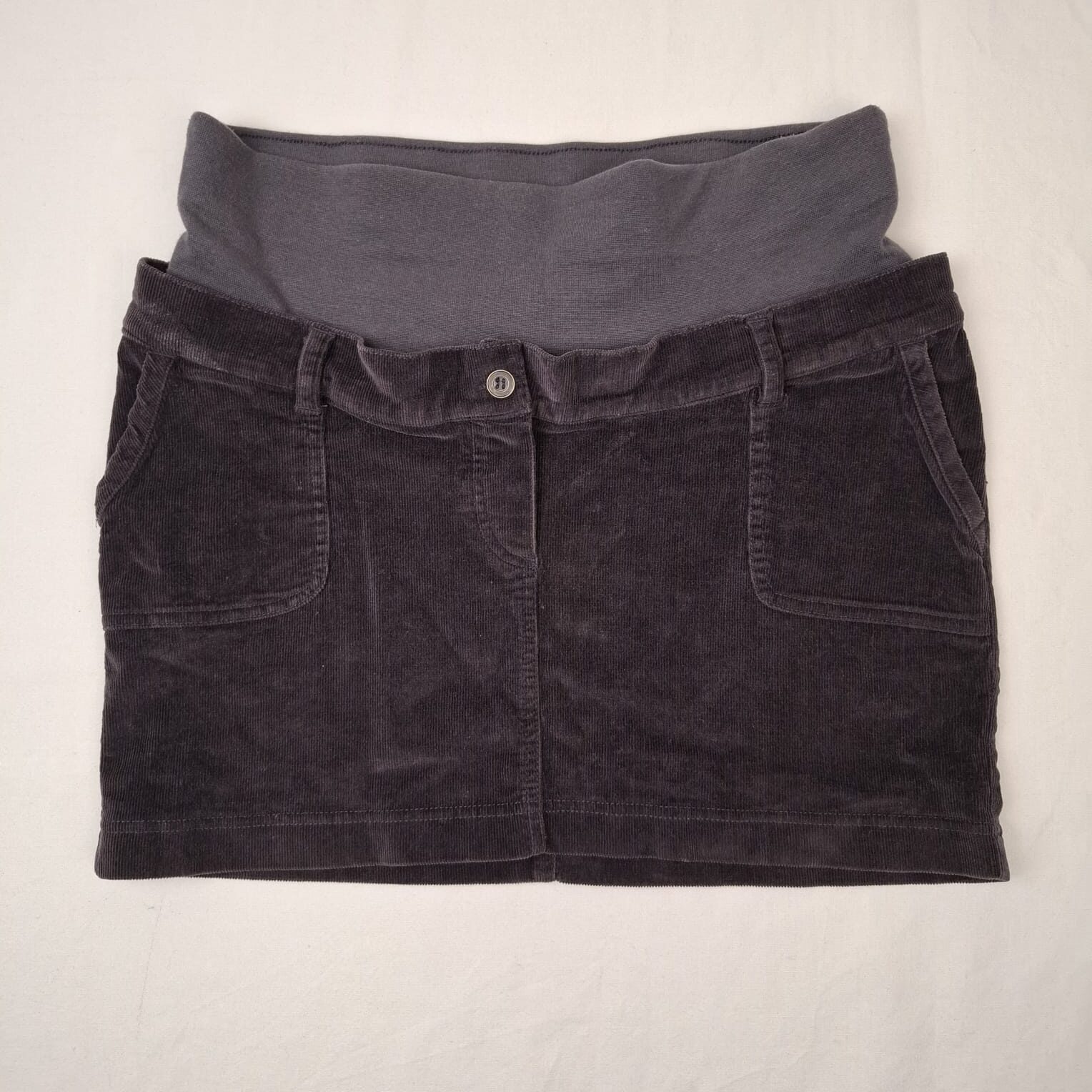 Autres commentaires : 3% élasthanne. Jupe courte en velours côtelé gris violet foncé, bandeau amovible par boutons pour soutien du ventre.