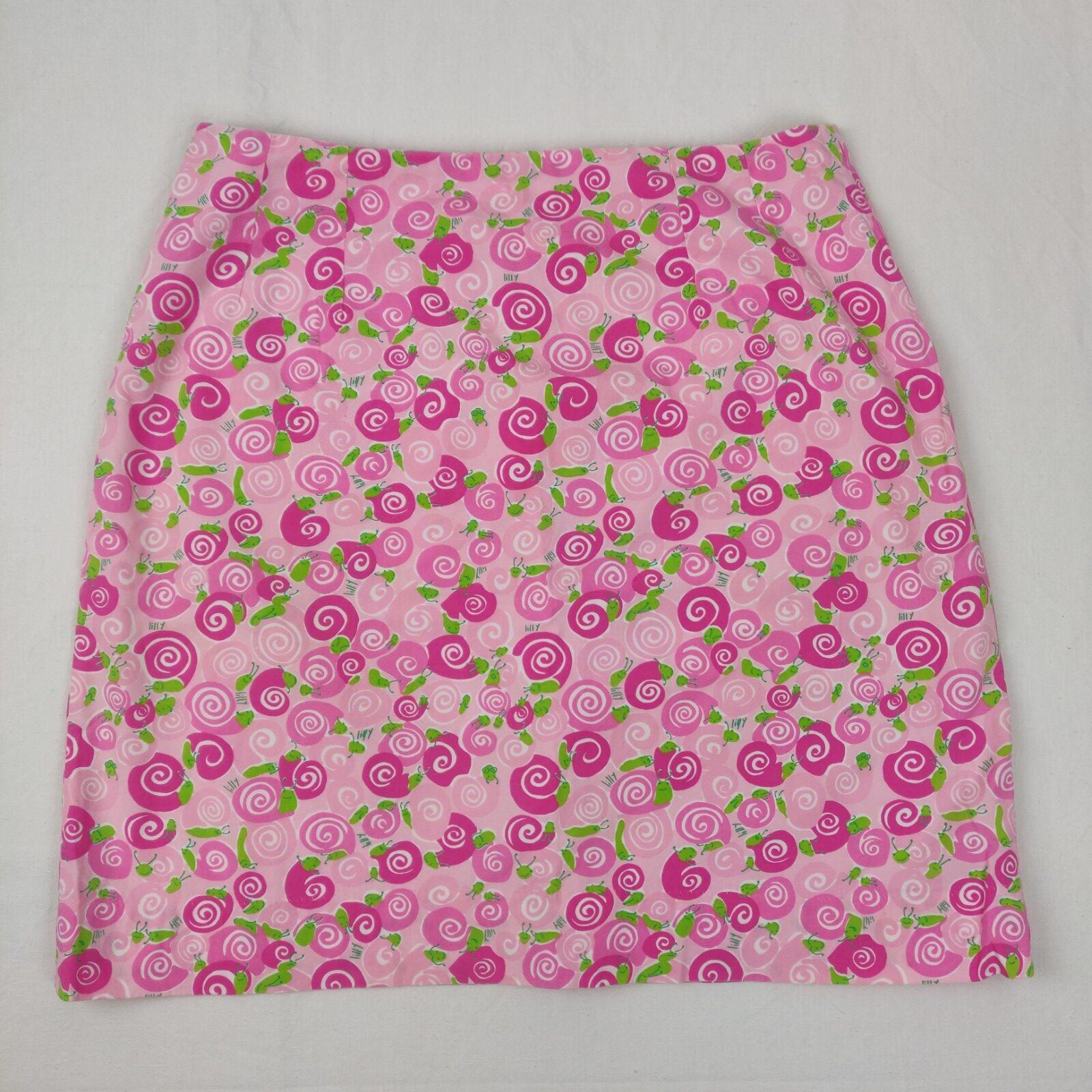 Autres commentaires : Jupe rose avec motif escargot rose et vert et une fermeture dérrière en zip.