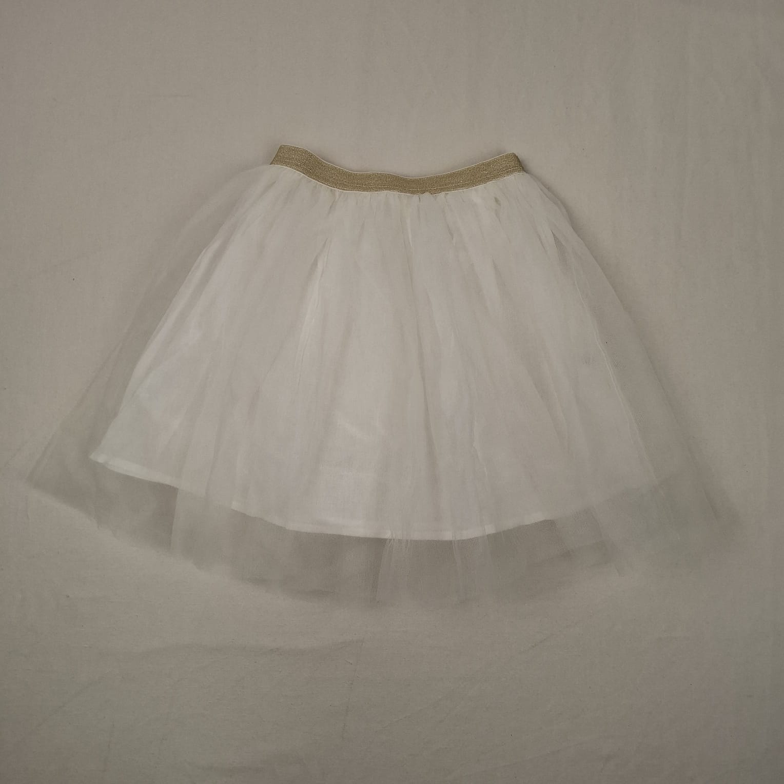 Autres commentaires : Jupe froncée blanche, avec dessous un jupon blanc surmonté de deux couches de tulle blanc, taille élastiquée et dorée, une jupe idéale pour une fête ou une cérémonie.