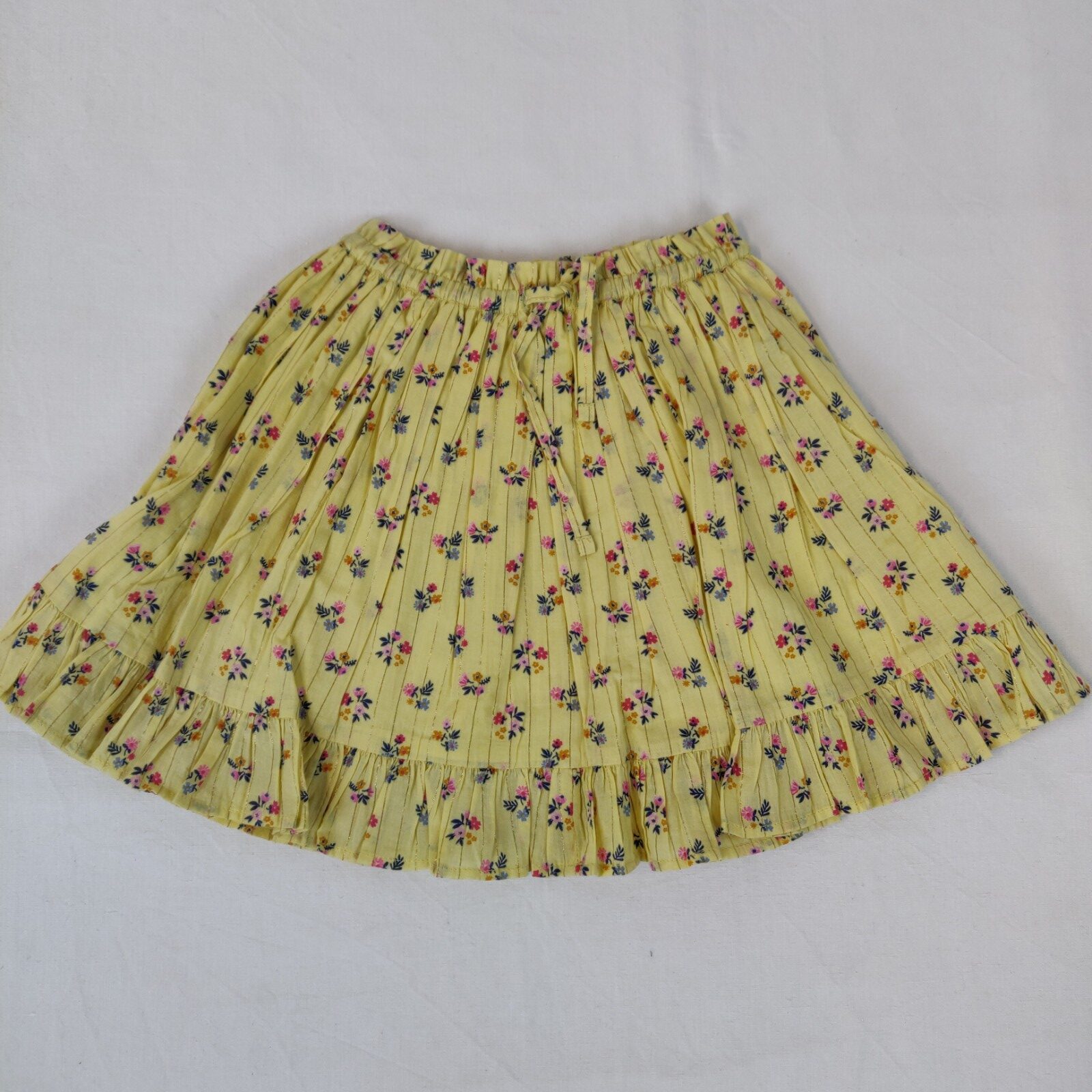 Autres commentaires : Jupe jaune plissée fleurette en bande dorée avec taille élastiquée doublé en toile de coton.