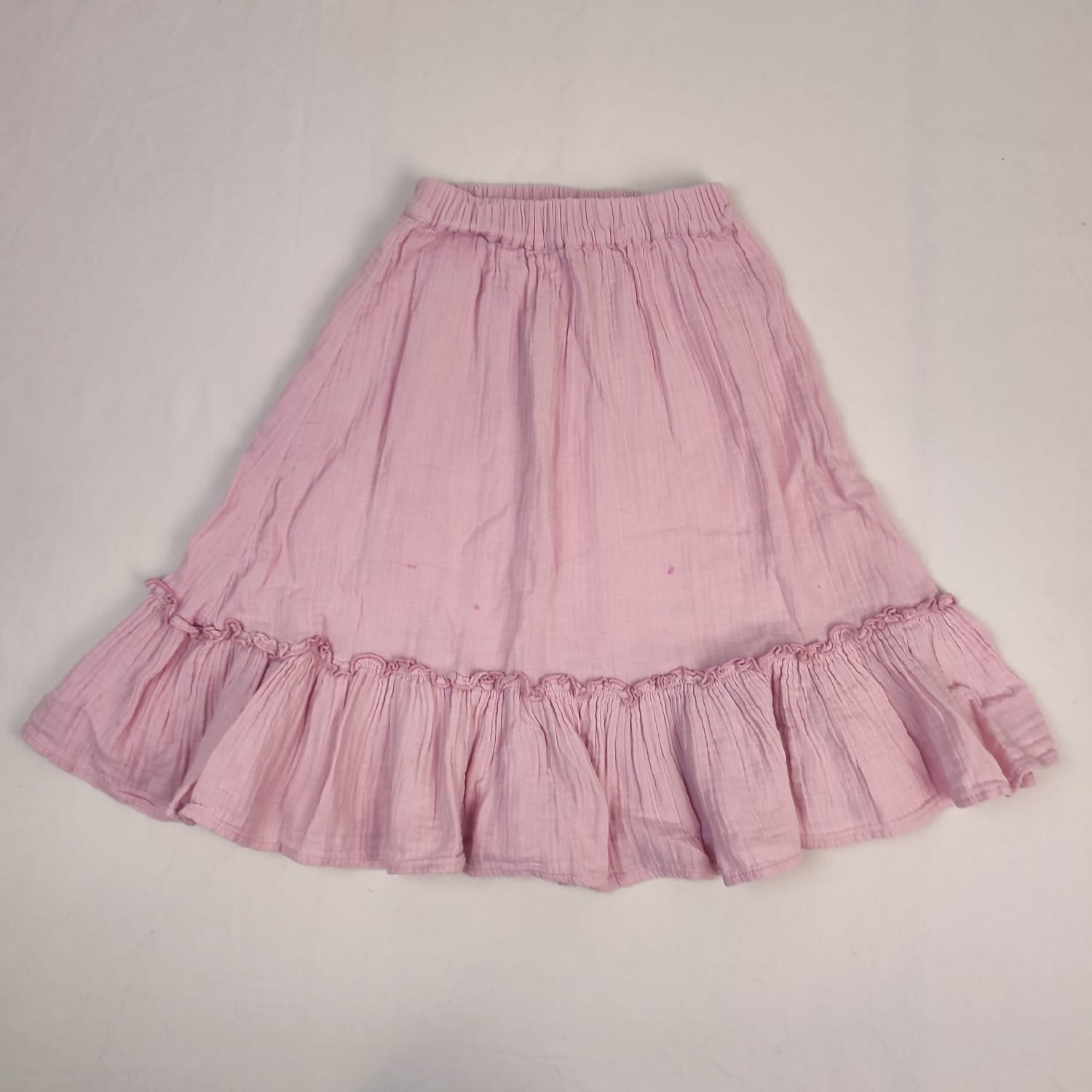 Autres commentaires : Jupe longue rose pastel,, aspect gaufré taille élastiquée et froncée, volanté en bas. Petit défaut : des petite taches roses de feutre, niveau réduit de Fraise à Myrtille.