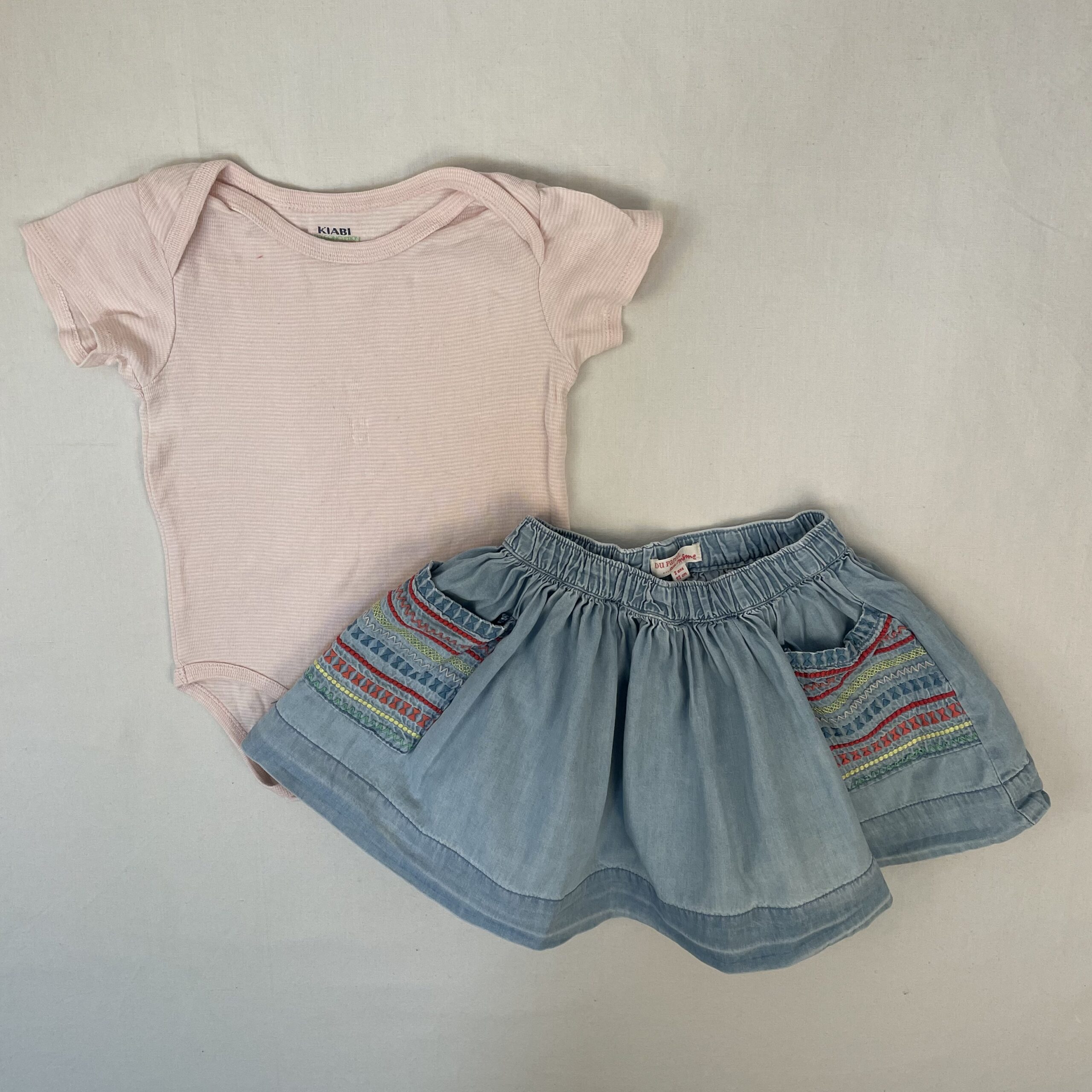 - Jupe patineuse en denim bleu clair, poches avec frises colorées brodées, taille élastiquée