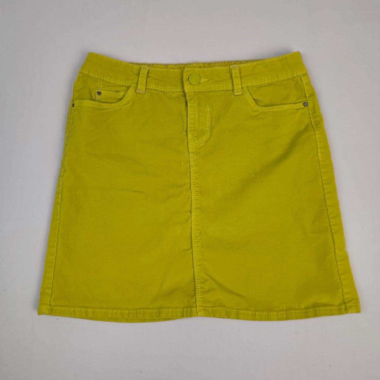 Autres commentaires : Jupe droite en velours côtelé jaune citron, tissu stretch, ceinture ajustable par élastique intérieur, fermeture devant par bouton et zip.